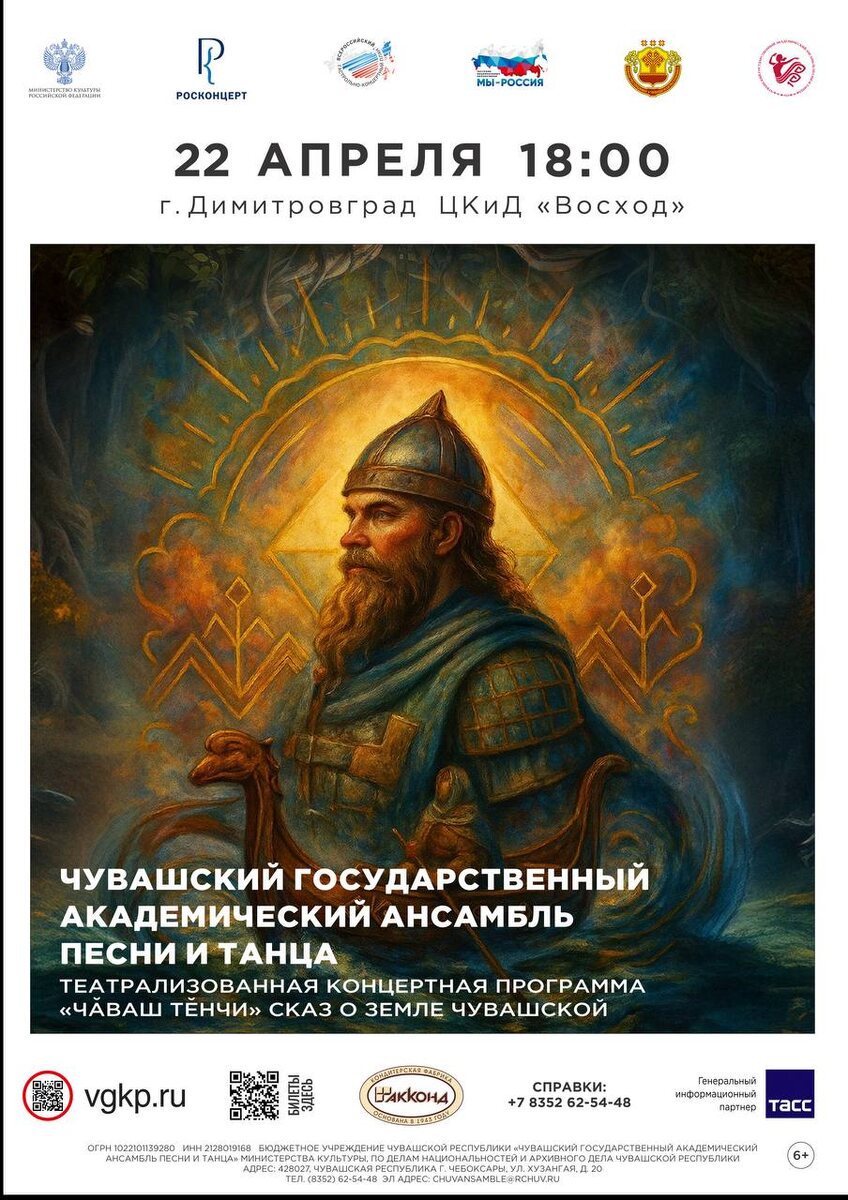 народного творчества. Но есть еще одна сокровищница ее культуры – древние сказы, легенды и предания. В каждом из них живет частичка души народа, передаваемая через поколения. Чувашский государственный академический ансамбль песни и танца бережно собрал и представил эти национальные ценности в концертной программе «Чăваш тĕнчи». Здесь оживают былины и истории давно минувших дней, а вместе с ними на сцену выходит богатырь Улып, символизирующий силу духа и любовь к родине. В красочную программу «Чăваш тĕнчи» (Сказ о земле чувашской) вошли номера из золотого фонда ансамбля, а также совершенно новые постановки: одноактный спектакль «О славном богатыре Улыпе», вокально-хореографические сюиты «Чувашия – сердце Волги», «Тихвинская ярмарка», хоровые произведения «Чăваш юррисен кăшăлӗ» (Попурри из чувашских песен), «В узенький проулочек». Каждое произведение станет настоящим открытием для зрителя, ведь оно воплощает в себе всю глубину и красоту чувашской земли, мудрость народа, живущего на бер