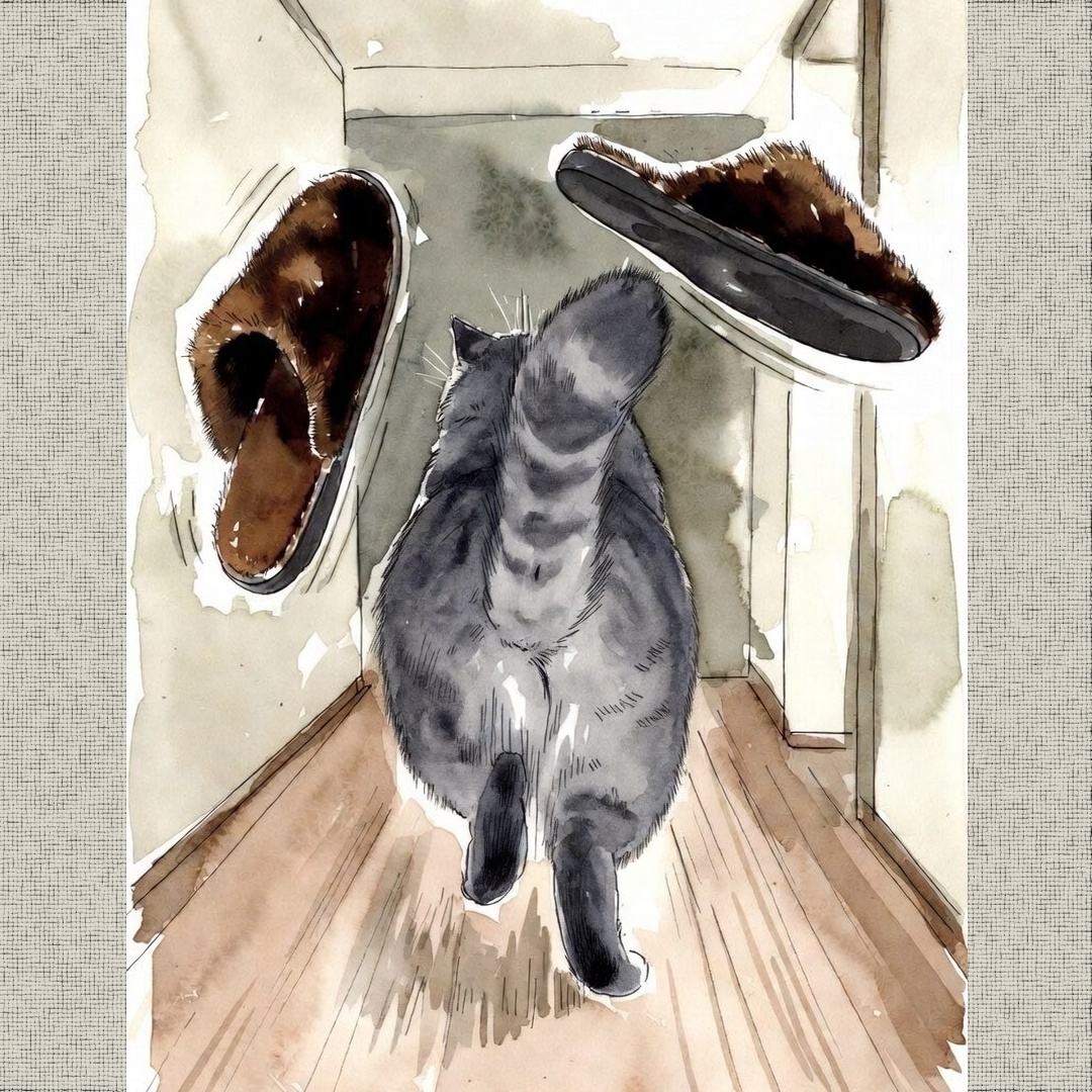Дверь открылась, когда кот "в поте лица морды" придвинул один тапок к ней поближе, а второй только начал пинать носом к первому.