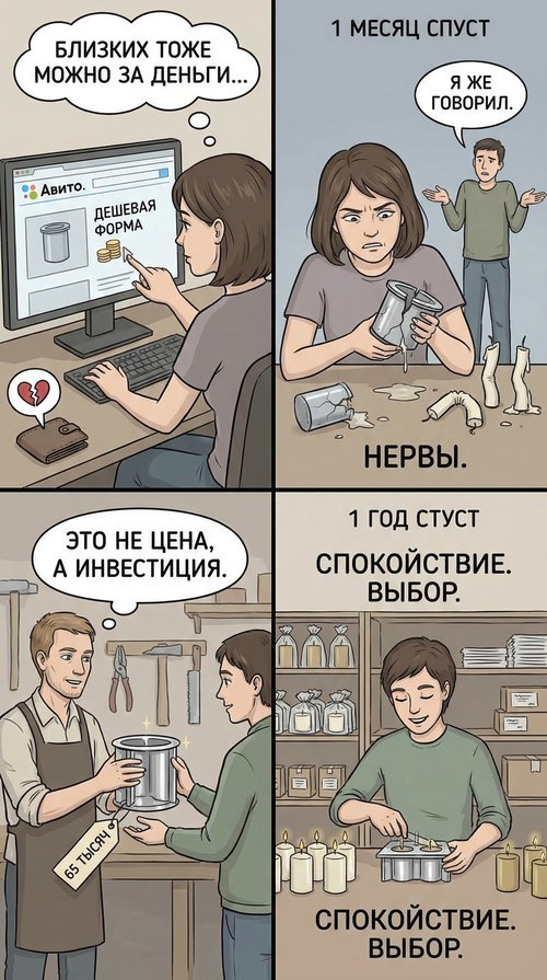 Прочитал про шаг 68. "Спросите, сколько клиент готов заплатить". Совет из учебника по продажам. Сильный прием, да. Если спросить человека "сколько вы готовы отдать", он часто называет цифру выше той, что вы собрались сказать. Психология. Я пробовал. Не работает с моими Ольгами. Спрашиваю: "Ольга, сколько вы готовы заплатить за форму, которая будет работать десять лет?" Ольга думает. Потом говорит: "Ну... тысяч пять?" Пять тысяч. За форму, которая будет работать десять лет. Которая сделана из алюминия 5 мм, с четкой геометрией, с учетом усадки воска, с рисунком, который не поплывет. Пять тысяч. Я не злюсь. Я понимаю: она не видела, как это делается. Она не знает, сколько стоит металл, сколько стоит работа фрезеровщика, сколько стоит мой опыт, который я набивал шишками пятнадцать лет. Она видит только цифру на ценнике в Авито и думает, что это и есть правда. Поэтому я перестал спрашивать "сколько готовы". Я говорю сразу: "Это стоит 65 тысяч". И смотрю на реакцию. Кто-то отваливается сраз