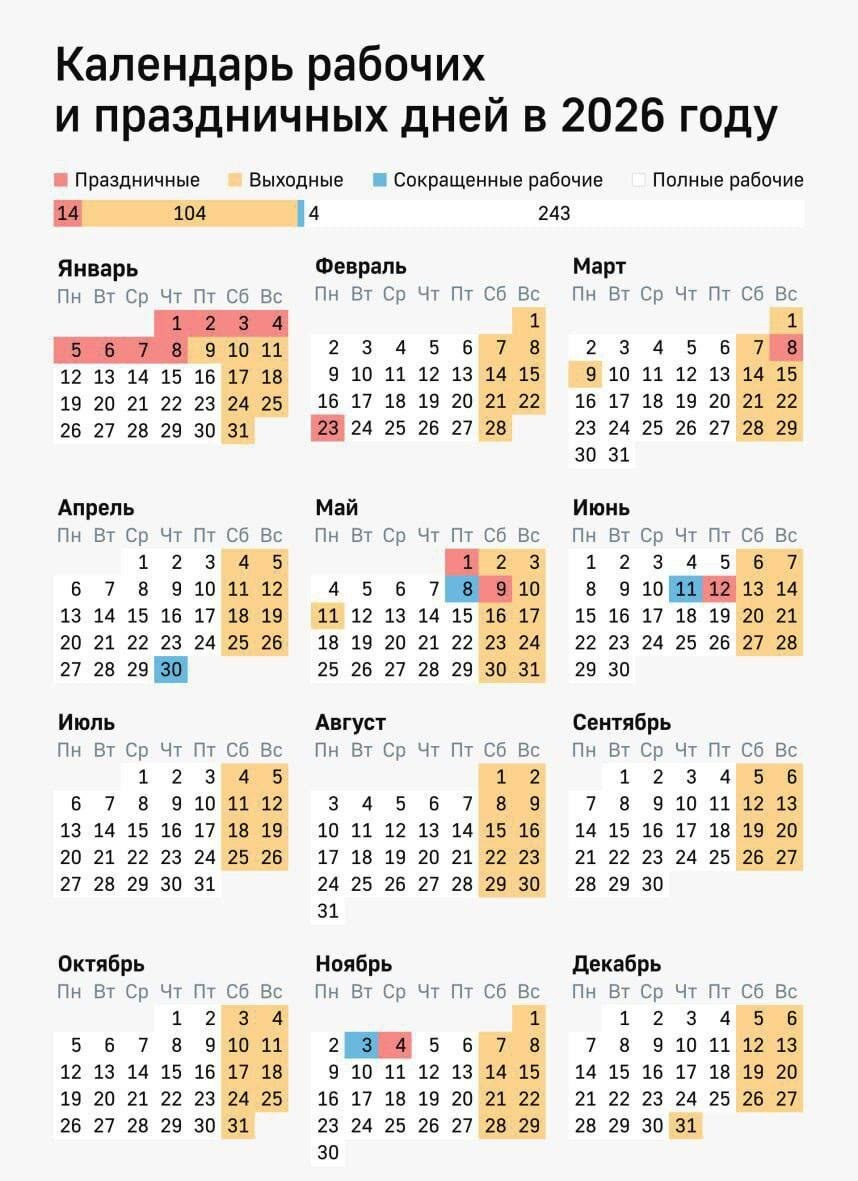 Второй квартал 2026 года порадует тремя периодами мини-каникул: • 1–3 мая — Праздник Весны и Труда; • 9–11 мая — День Победы; • 12–14 июня — День России. Депутат Госдумы Светлана Бессараб напомнила, что 30 апреля, 8 мая и 11 июня рабочий день будет сокращен на час. В третьем квартале, кроме стандартных уикендов, дополнительных «окон» для отдыха не ожидается.