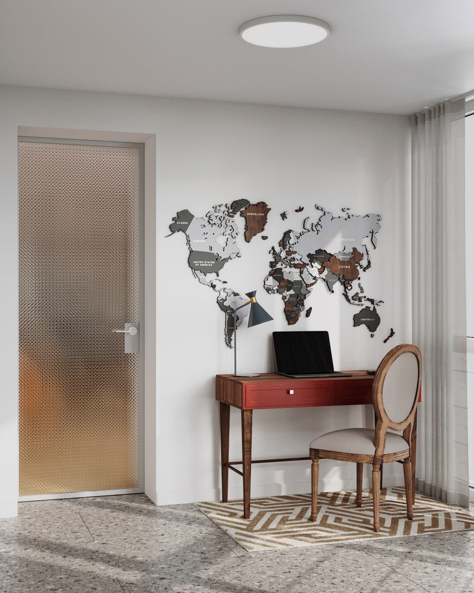 🌍 Кабинет разместили в утеплённой лоджии. Это небольшое, но очень атмосферное пространство для работы, планирования и вдохновения в проекте #градиз_калейдоскоп. Главный акцент — стилизованная деревянная карта мира. Она не только декоративная, но и эмоциональная: напоминание для жильцов о пройденных маршрутах и точках, куда хочется вернуться. Кабинет получился камерным, светлым и наполненным смыслом — идеальным для сосредоточенной работы и мечтаний. Даже маленькое пространство можно сделать особенным, если заложить в него личную историю через детали 📎 Другие комнаты проекта «Калейдоскоп» смотрите тут! #атмосферный_проект #градиз_калейдоскоп