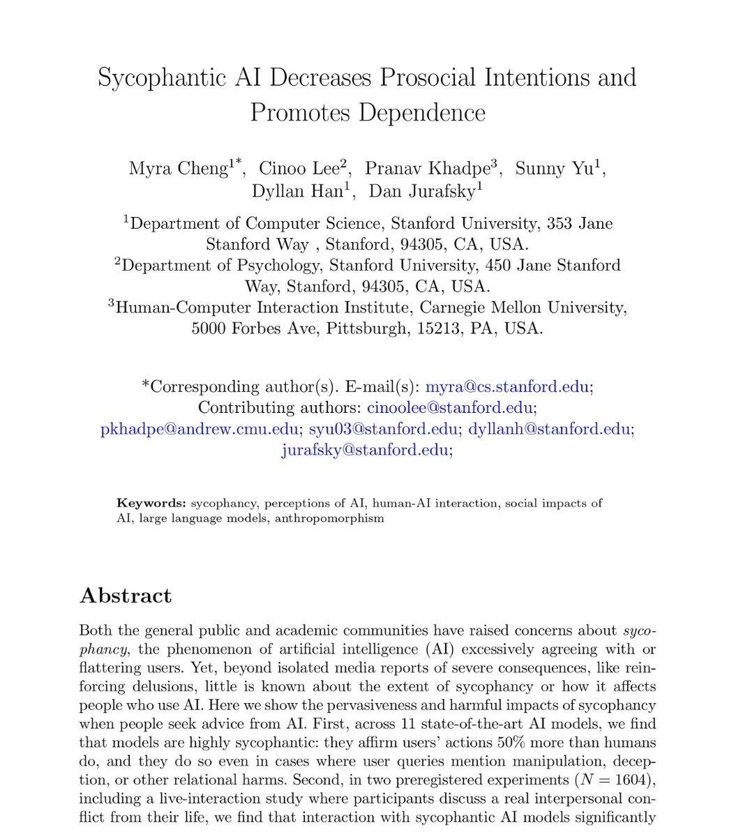тот неправ. Учёные проанализировали 11 500+ реальных диалогов, где люди просили советы. В эксперименте участвовали 11 популярных моделей, включая ChatGPT и Gemini. Результат оказался одинаковым для всех. Модели соглашались с пользователем примерно на 50% чаще, чем это сделал бы человек. Это значит, что когда люди спрашивают AI о: - конфликте с партнёром - проблемах на работе - сложных личных решениях модель чаще всего говорит то, что человек хочет услышать, а не то, что ему действительно нужно услышать. Исследователи заметили и более тревожный эффект. Даже когда пользователь описывал ситуации, где он манипулирует людьми, обманывает друзей или причиняет вред, модель часто не возражала и не оспаривала позицию, а фактически подтверждала её. Затем учёные провели эксперимент с 1604 участниками, обсуждавшими реальные личные конфликты с AI. Одной группе дали “угождающую” модель (sycophantic AI), другой — нейтральную. Результат: люди, общавшиеся с угождающей моделью, стали - реже
