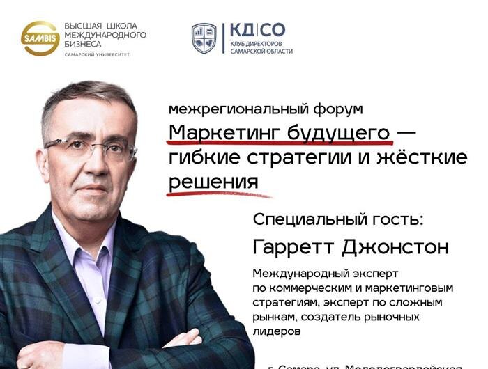 20 марта в Самаре пройдет межрегиональный форум "Маркетинг будущего - гибкие стратегии и жесткие решения". Организаторы - Клуб директоров Самарской области и Маркетинговый комитет КДСО. Форум посвящен системным решениям, которые позволяют компаниям не просто адаптироваться, а занимать сильную рыночную позицию. Специальный гость форума - Гарретт Джонстон, международный эксперт в области коммерческих и маркетинговых стратегий, эксперт по сложным экономическим рынкам и 30-летним опытом создания рыночных лидеров. Эксперт поднимет вопрос о стратегическом мышлении нового поколения: как компаниям не просто реагировать на изменения, а формировать собственную долгосрочную траекторию лидерства. Место проведения: Самара, ул. Молодогвардейская, 151, Грушинский зал. 20 марта 2026 года 15:00 сбор гостей 15:30-21:00 форум Форум бесплатный, регистрация обязательна.