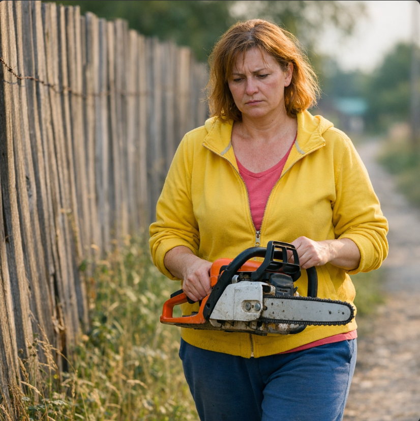 Тамара шла по тропинке вдоль забора с бензопилой в руках, и это явно был не самый лучший момент в ее жизни.