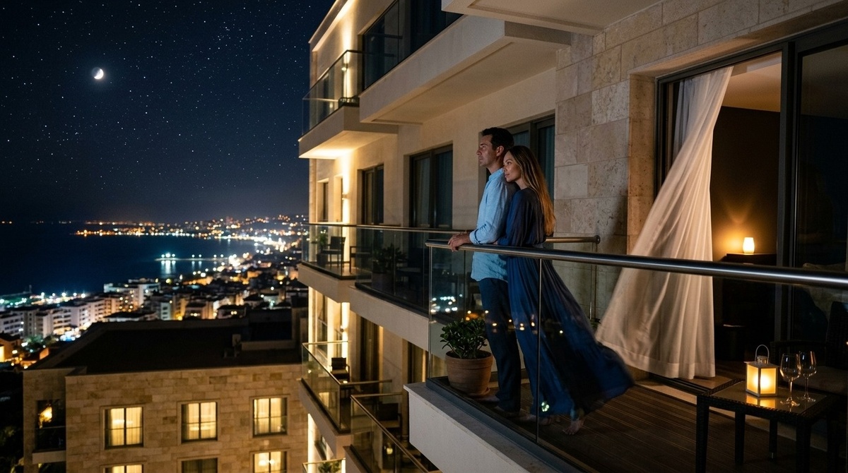 В её номере горел только ночник. Балкон был открыт, шторы колыхались на ветру, впуская запах моря и ночных цветов. Они вышли на балкон, и Катя прижалась к нему спиной, его руки обняли её за талию. Они стояли так долго, глядя на звёзды, на море, на огни города внизу.