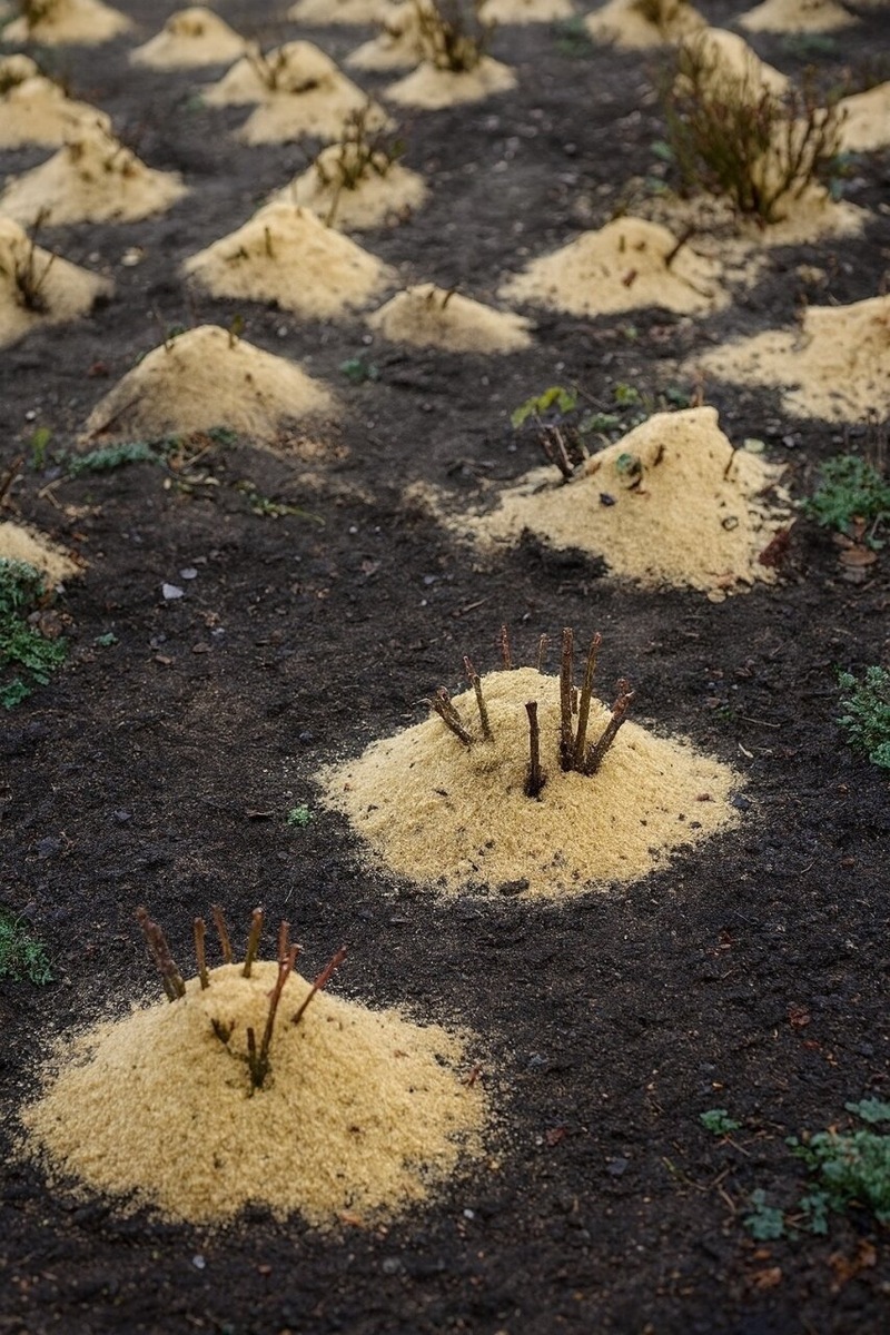 Почву вокруг куста надо избавить от сорняков и прорыхлить. Растение обработать фунгицидами, после чего окучить землей, опилками или песком.
