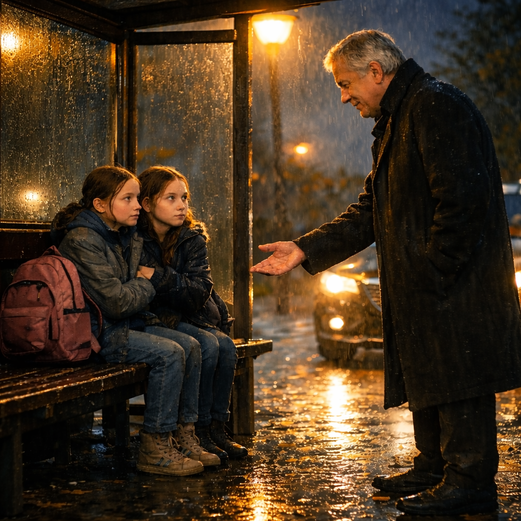 Мужчина мгновение стоял под дождём, разглядывая девочек. Потом медленно подошёл ближе и остановился у края остановки.