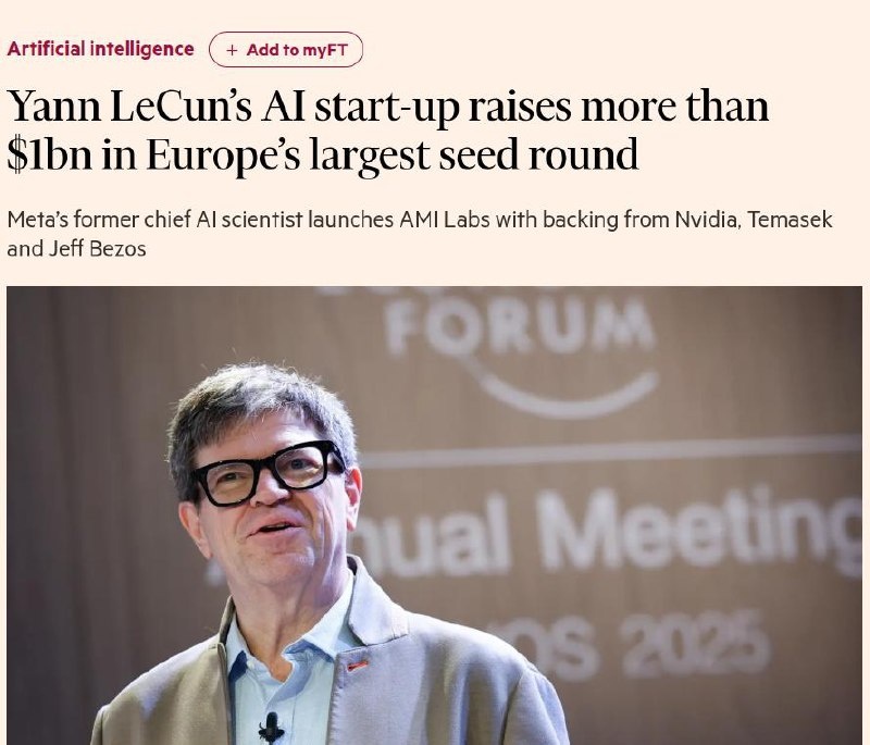 📢 FT: стартап Янна Лекуна AMI Labs привлёк $1.03 млрд для разработки world models