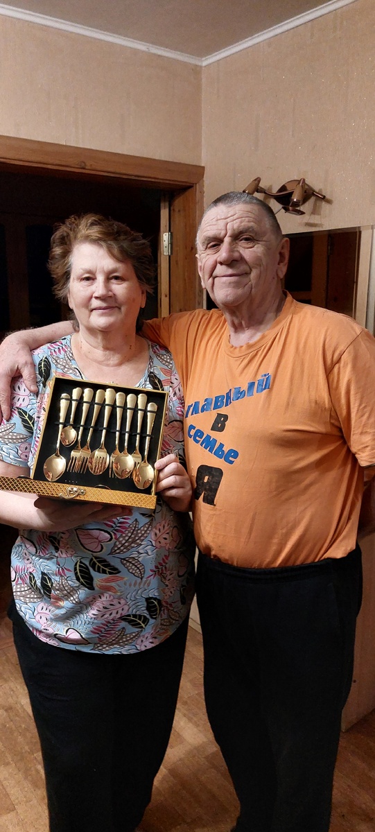 Всем добрый день! У нас в Барнауле он довольно пасмурный и снежок чуть сыплется. А вообще на нашей памяти в это время на Алтае всегда снега и бураны. У нас например, вчера был довольно большой юбилей - 50 лет супружеской жизни - и опять был и буранец, снежок... И мы его, этот день, решили никак не отмечать. То ли подустали от передвижений, то ли разленились, но ничего практически не делая целый день , уже к вечеру заняли по своим комнатам "позиции перед ТВ" и не ожидали , что кто-то нас побеспокоит. А неееееттт. Вдруг слышу к 8 вечера, что дверь открывается и заходят обе наши дочки и говорят: - Родители, вставайте! Пришли мы, плоды вашей жизни, и эти плоды хотят вас поздравить с юбилеем! Если бы не вы, то не было бы и нас ... ну и всё такое. Ну, мы радостно приняли приветствие и поздравление, а они смеются и говорят: -Вот вам золотые ложки/вилки/ложечки, чтобы вы с золота ели! И подарили нам красивенький сувенирный набор под золото. Вот мы стоим на первом фото к этой статье и де