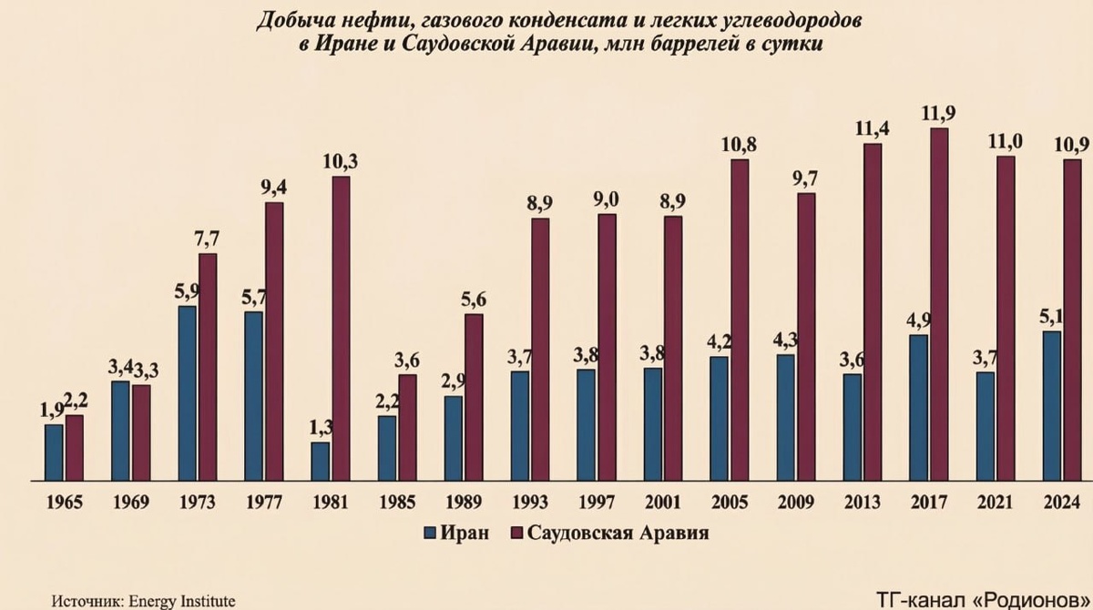 Для сравнения: по данным Energy Institute, в 1974 г., когда нефтедобыча в Иране достигла исторического максимума, объем предложения составлял 6,1 млн б/с, а доля – 10%, а в 1977 г., накануне революции, – 5,7 млн б/с и 9% соответственно.