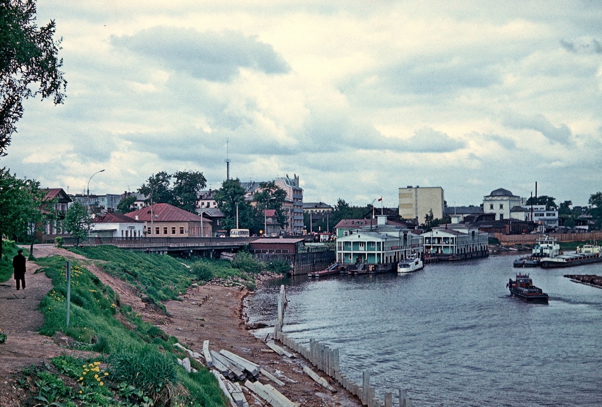 1978 год. Вид на Советский проспект и речной вокзал. На переднем плане идёт укрепление берега у Петровского домика / прислал Александр Муханов Начало истории речного вокзала в это месте можно отнести к 1883 году. Именно тогда архангельский купец 1 гильдии Булычев подал прошение в городскую думу о разрешении построить в этом месте пристань для остановки пароходов. Изначально она использовалась для работы только с грузами, но спустя некоторое время сюда от Красного моста перебрались и пассажирские перевозки.