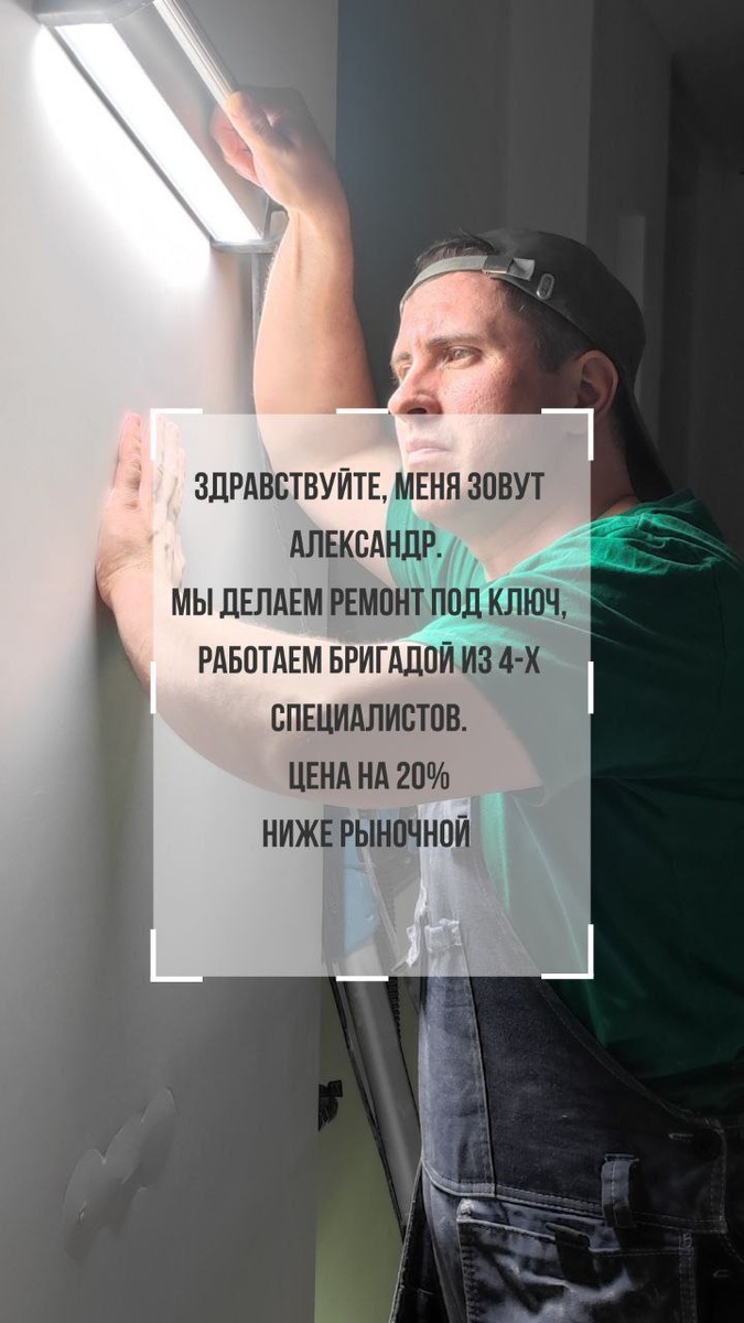 Мы с бригадой из 4-х специалистов делаем ремонт под ключ. ЦЕНА НА 20% НИЖЕ РЫНОЧНОЙ! Подбираем оптимальные решения для вашего ремонта, сохраняем уровень качества и ваш бюджет. Как мы с вами работаем: • Созваниваемся для консультации. Обсуждаем ваши пожелания по ремонту, объем работ: это поможет сориентироваться по стоимости. Договариваемся о встрече. • Встречаемся на объекте, обсуждаем, как лучше воплотить ваш проект. Рекомендую, какие материалы использовать. Если нет проекта – посоветую планировочные решения, расположение сантехники, розеток и т.д. • Рассчитываю стоимость работ. ВАЖНО: финальная стоимость будет той, о которой мы договорились на старте. • Назначаем дату начала работ и заключаем договор с гарантией в 3 года. • Поэтапно выполняем работы с подробным отчетом. Беру на себя все вопросы организации ремонта: доставки, вывоз мусора, взаимодействие с управляющей компанией, субподрядчиками. • Продемонстрирую качество выполненных работ при сдаче каждого этапа. • Мы сдаем