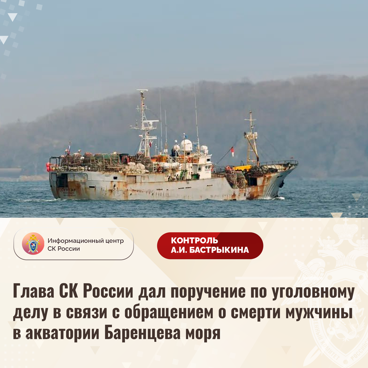 Глава СК России дал поручение по уголовному делу в связи с обращением о смерти мужчины в акватории Баренцева моря В приёмную Председателя СК России А.И. Бастрыкина в социальной сети «ВКонтакте» поступило обращение по вопросу нарушения требований охраны труда в ООО «Антей Север». В феврале прошлого года мужчина, являвшийся вахтенным матросом на краболовном судне, выпал за борт в акваторию Баренцева моря и пропал без вести. Причиной происшествия явилось отсутствие необходимых защитных ограждений на корме корабля. Отмечается затяжной характер расследования уголовного дела, до настоящего времени никто к ответственности не привлечен. Указанная ситуация освещалась в СМИ. В Западном МСУТ СК России расследуется уголовное дело. Председатель Следственного комитета Российской Федерации Александр Иванович Бастрыкин поручил руководителю Западного МСУТ СК России Виталию Владимировичу Саксину ускорить расследование уголовного дела и представить доклад о результатах с учетом озвученных в обращении до