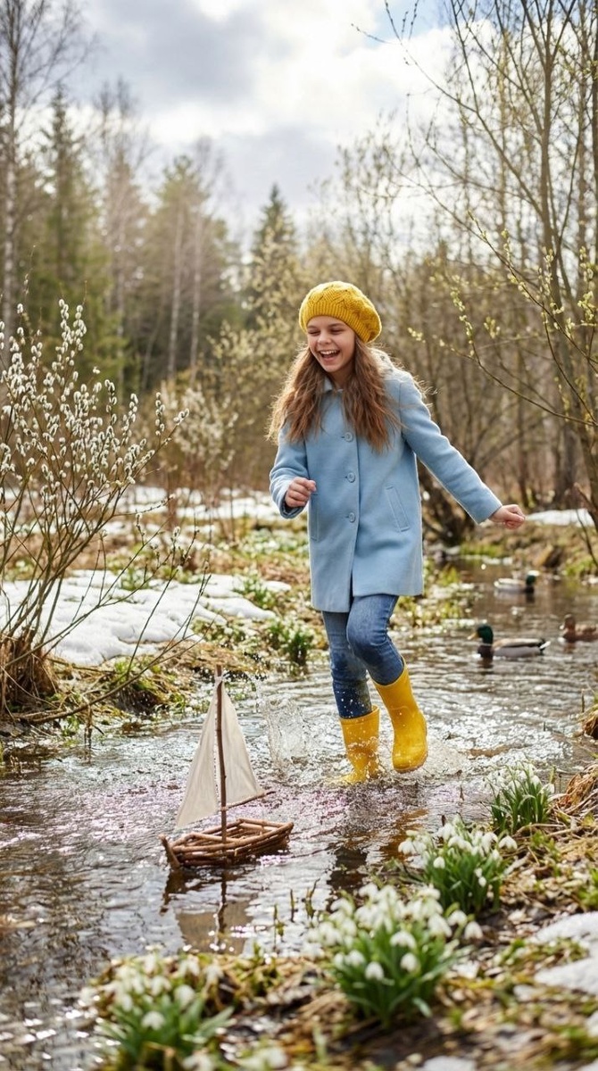 Поддержим лайками! Nano banana 2 Создай ультрареалистисный кадр. Сохрани точную копию лица 1:1 с исходного кадра. Соблюдай пропорции тела. Фон: весенний лес, на деревьях небольшие листочки почки. Цветёт верба,местами лежит снег, растут белые подснежники. Голубое небо, сквозь тучи пробиваются теплые лучи Солнца. На переднем плане течёт ручей, по Русью бежит за корабликом девочка 11 лет , брызги летят в разные стороны . Кораблик из деревянных палочек , парус из белой ткани. В ручье плавает несколько уток. Одежда: желтые короткие резиновые сапоги, нежно голубого цвета пальто, джинсы, на голове жёлтый вязанный детский берёт. Настроение весёлое, радостное. Реалистичное фото, атмосферное. Качество 8к, резкость на девочке и кораблике. Вертикальный кадр 9:16 Делаю в gptunnel (промокод на скидку 75% PROMPT1_75 ) или телеграмм боте LookKit AI(2 генерации в Nano Banana PRO бесплатно) #весна@prompt1_ru #2_место@prompt1_ru #детские@prompt1_ru #лес@prompt1_ru