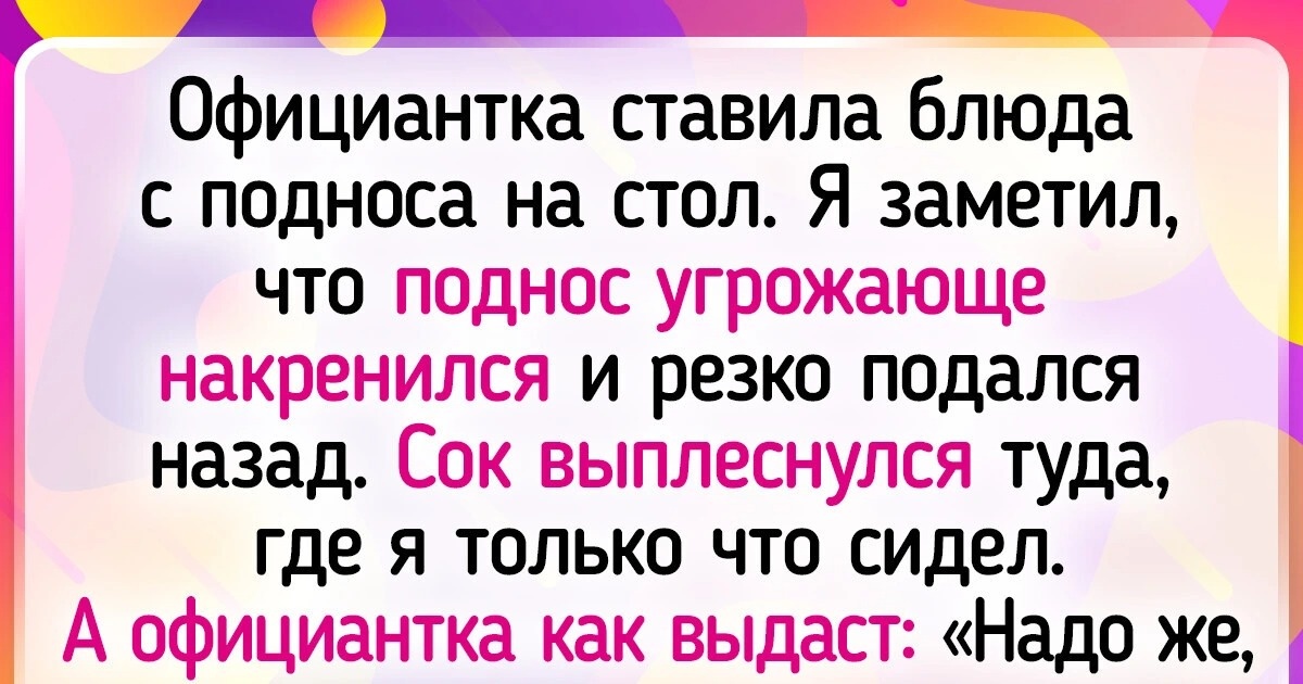 Официантка ставила блюда с подноса на стол. Я заметил, что поднос угрожающе накренился и резко подался назад. Сок выплеснулся туда, где я только что сидел. А официантка как выдаст: «Надо же, вы первый, кому удалось увернуться, когда я что-то проливаю».