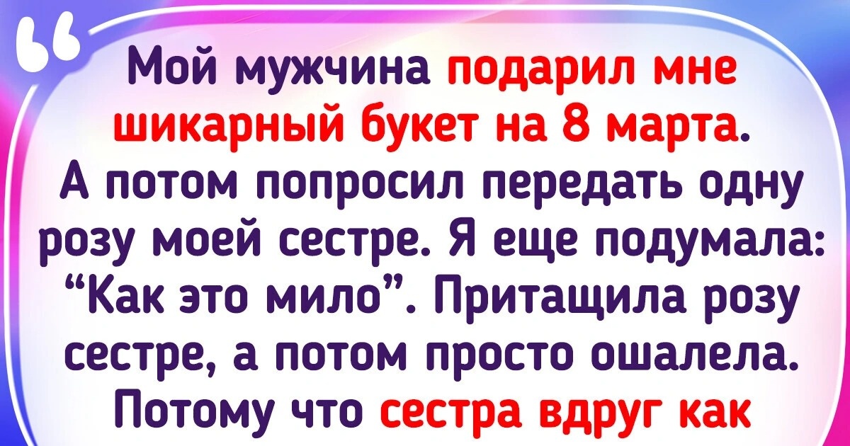 Мой мужчина подарил мне шикарный букет на 8 марта. А потом попросил передать одну розу моей сестре. Я еще подумала: "Как это мило". Притащила розу сестре, а потом просто ошалела. Потому что сестра вдруг как ляпнула: "Почему он нас двоих любит, а мне досталась только роза?!"