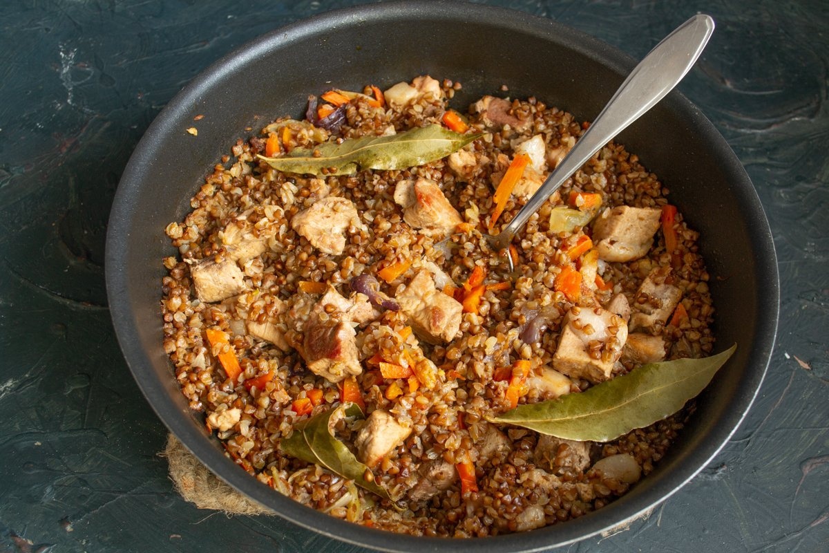 Плов из гречки — блюдо, которое готовится по принципу рисового плова: овощи, мясо и крупа тушатся в одной посуде. Существуют разные варианты плова из гречки: с курицей, со свининой или с говядиной.