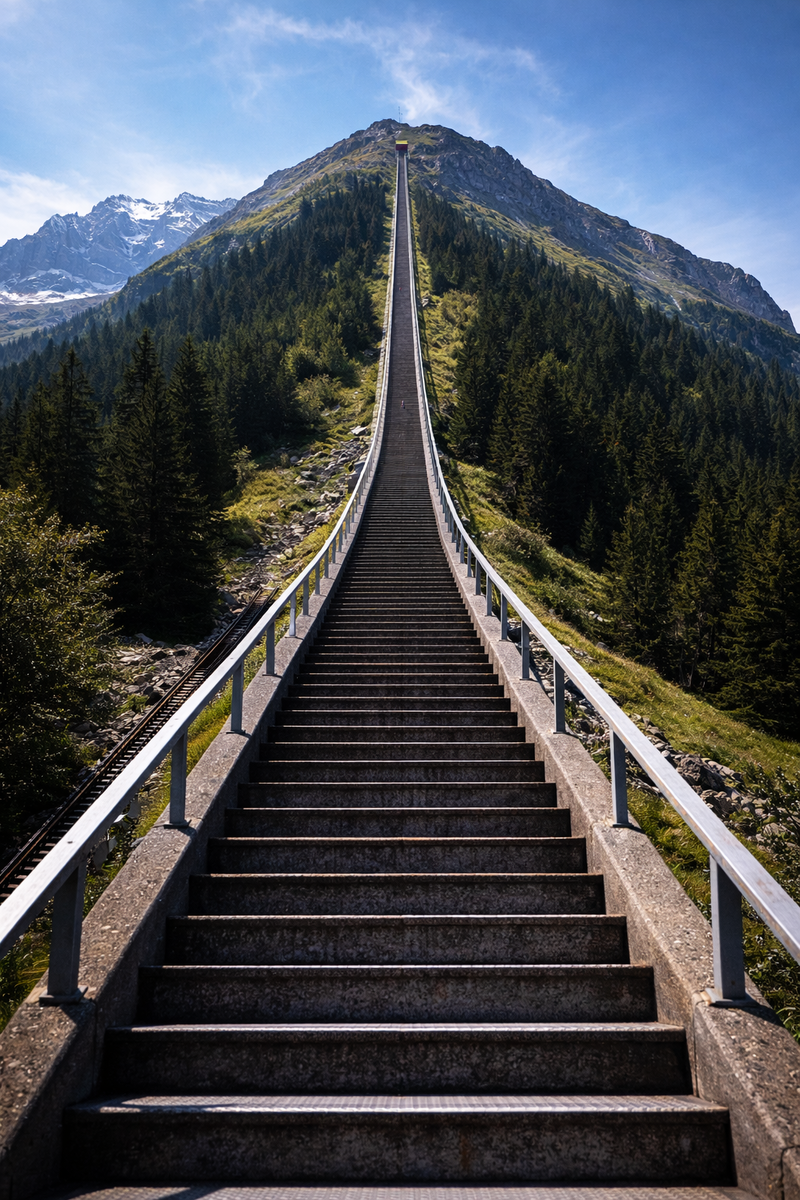 Представьте лестницу, по которой нужно подняться почти на два километра вверх. Без лифта, без остановок, только ступени — одна за другой. Их 11 674, и если смотреть снизу, они уходят вверх так далеко, что теряются на склоне горы. Эта лестница находится в Швейцарии и считается самой длинной лестницей на планете. Подъём по ней настолько тяжёлый, что многие сравнивают его не с прогулкой, а с настоящим альпинистским восхождением. Разница лишь в том, что вместо скал здесь тысячи аккуратно уложенных ступеней. Но самое удивительное — лестница появилась не как туристическая достопримечательность. Её построили по совершенно другой причине. Лестница тянется вдоль одной из самых крутых железных дорог Европы Эти 11 674 ступени расположены на склоне горы Низен в Швейцарских Альпах. Рядом проходит фуникулёр — железная дорога, по которой вагоны поднимаются вверх под очень крутым углом. Когда эту дорогу построили в начале XX века, рядом понадобился служебный проход для сотрудников. Им нужно было обсл