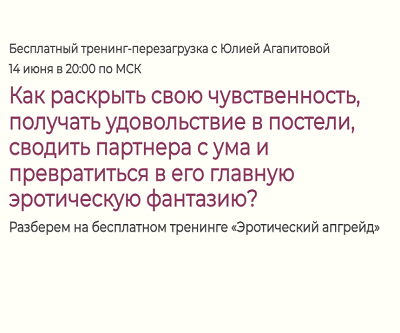 Присоединяйтесь к бесплатному тренингу «Вкус чувственной власти над мужчиной», где Юлия Агапитова поделится проверенными рецептами женского и