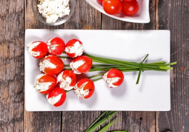 " Ингредиенты: 8-10 шт. томатов-сливок (или крупных черри), 100 г мягкого творожного сыра, 1 пучок зеленого лука, 1 зубчик чеснока, свежий укроп. Приготовление. Зелень вымойте, обсушите. Укроп нарубите. Чеснок очистите, раздавите. Смешайте творожный сыр с чесноком и рубленым укропом. Томаты вымойте, обсушите бумажным полотенцем и в каждом сделайте с верхушки глубокий надрез крест-накрест. Если помидоры очень сочные, излишек сока с семенами удалите чайной ложкой. Каждый томат наполните творожно-чесночной смесью (удобнее это делать при помощи кондитерского мешка). Выложите на плоское сервировочное блюдо перья зеленого лука – это будут "стебли тюльпанов" (можно перевязать их тонкой яркой луковой "ленточкой" как букет). В верхней части "букета" разместите "бутоны" – фаршированные томаты. ♦️ НА ЗАМЕТКУ! Начинку "тюльпанов" можно разнообразить по своему вкусу – вместо творожного сыра использовать смесь отварных яиц и крабовых палочек, отварных яиц и плавленого сыра, отварного риса с припр