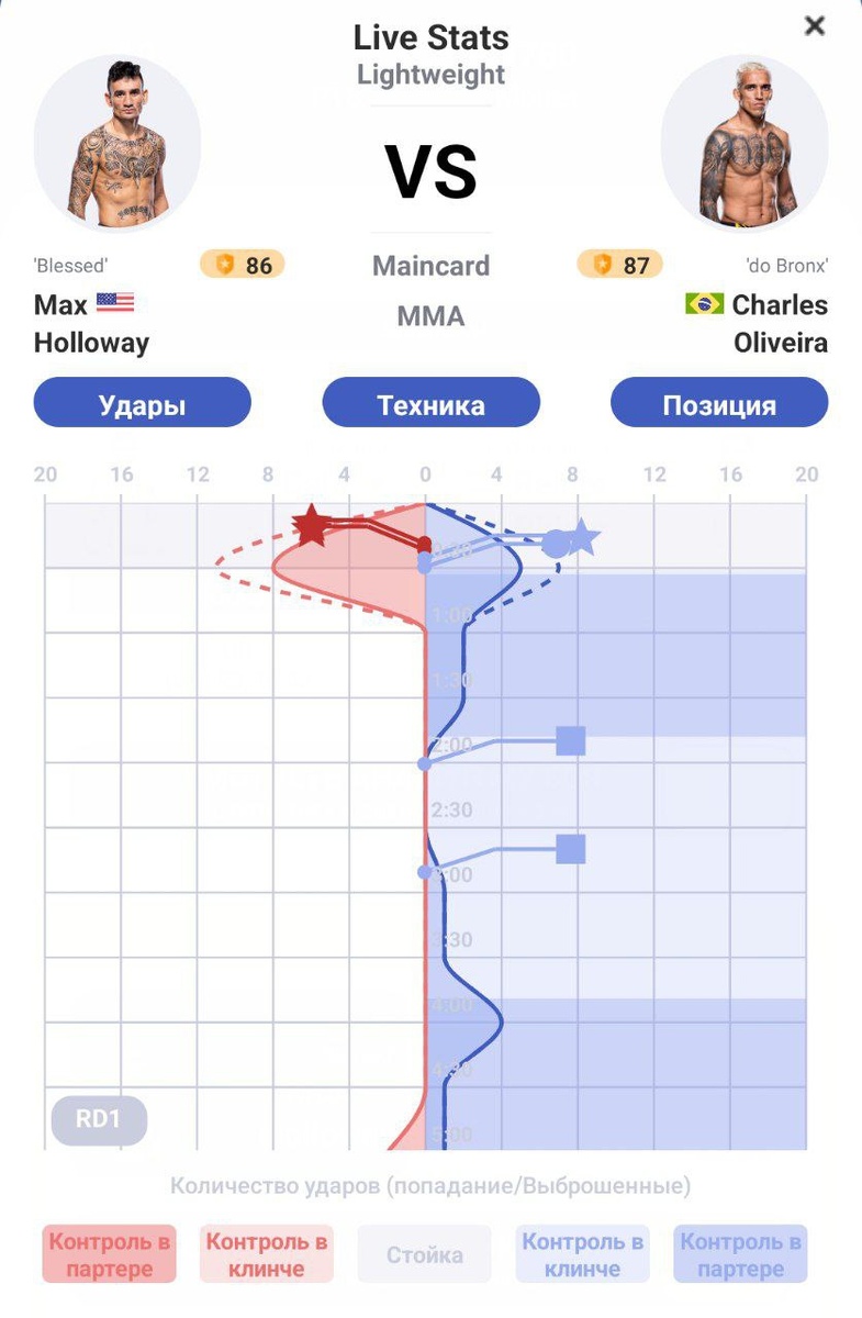 ! Очень классно начал бой Чарльз – оформил эффектный тейкдаун, а дальше рюкзаком повис за спиной Макса. Холлоуэй не смог ничего противопоставить бразильцу и провел 5-минутку в обороне. Смотрим Динамику боя в приложении Stats Fight.
