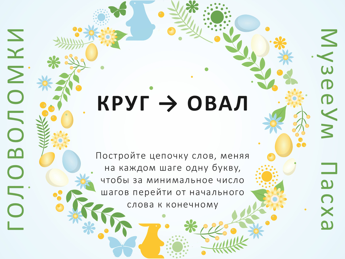 🧩 Представьте: за окном весна, в доме пахнет куличами, а вы наслаждаетесь спокойным моментом с чашкой чая и этой головоломкой. Идеальная пасхальная пауза! 🐣 Пусть она подарит вам улыбку и приятные размышления. 🕊️ ❓ Решите головоломку: Постройте цепочку слов, меняя на каждом шаге одну букву, чтобы за минимальное число шагов перейти от начального слова (круг) к конечному (овал). 🔗 Больше интересных пасхальных головоломок в библиотеке МузееУм: