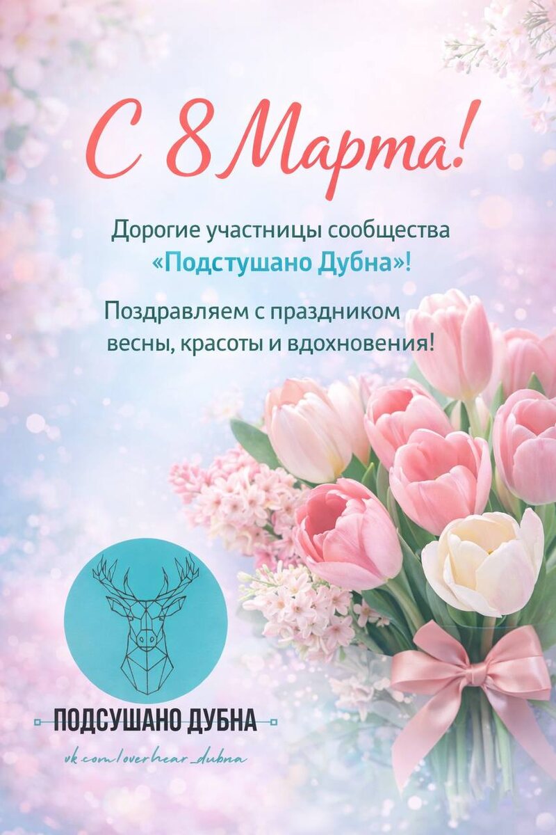 Дорогие участницы сообщества «Подслушано Дубна»🌷 Администрация группы от всей души поздравляет вас с 8 Марта — праздником весны, красоты и вдохновения! Пусть каждый день будет наполнен радостью, теплом и приятными моментами. Желаем вам крепкого здоровья, любви, гармонии и исполнения самых заветных желаний. Пусть рядом всегда будут люди, которые ценят, поддерживают и делают вашу жизнь ярче. Спасибо, что вы с нами, делитесь новостями, поддерживаете друг друга и делаете наше сообщество живым и настоящим. 💐 С праздником, прекрасные девушки и женщины! С любовью, администрация «Подслушано Дубна» 💖