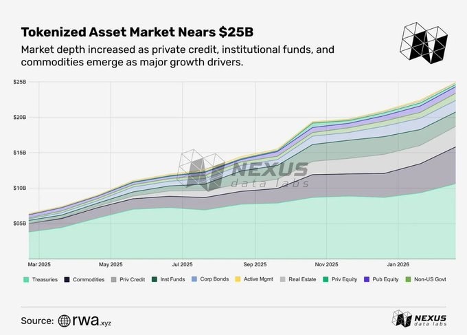 🔸Согласно данным Nexus, общая стоимость токенизированных реальных активов (RWA) достигла $24,9 млрд, увеличившись почти в 4 раза за