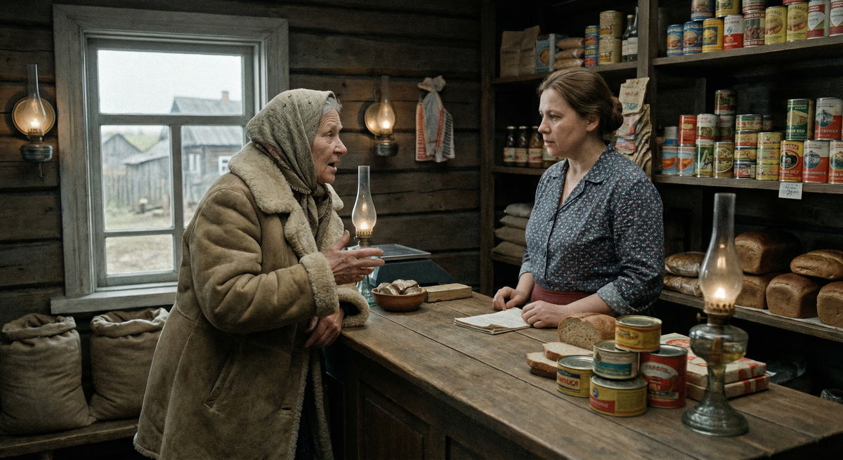 Сельмаг стоял на пригорке — бревенчатый, покосившийся, с вывеской «ПРОДУКТЫ», где буква «О» давно выцвела и читалось «ПР ДУКТЫ». Крыльцо скрипело так, будто жаловалось на жизнь.