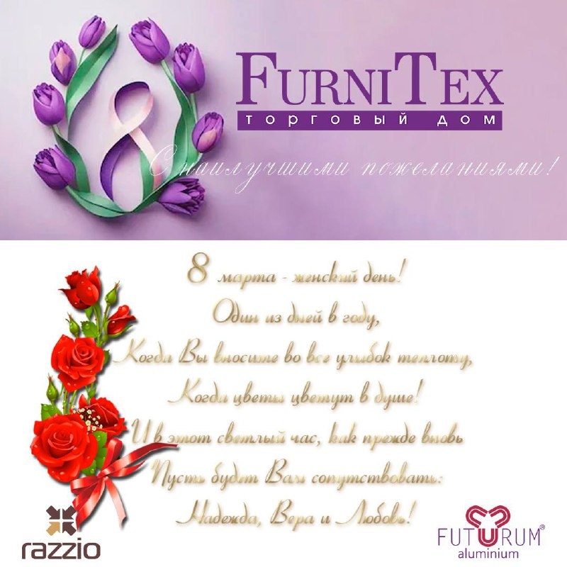 ! От всего сердца поздравляем вас с Международным женским днём — 8 Марта! Вы — яркий пример силы и уверенности, сочетающихся с красотой и лёгкостью. Ваша энергия вдохновляет, а профессионализм вызывает искреннее восхищение. Желаем, чтобы все мечты сбывались, каждый день приносил радость, а рядом были любящие и понимающие люди. Крепкого здоровья, благополучия, успехов в бизнесе и новых ярких достижений! С тёплыми пожеланиями, мужская половина Furnitex❤️