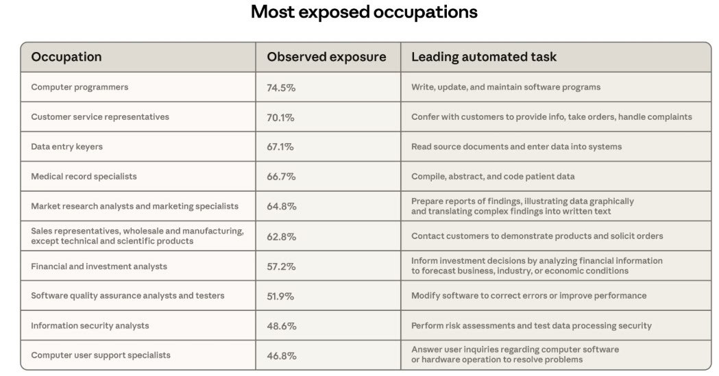 📊 Anthropic опубликовала список профессий, которые ИИ уже делает за людей