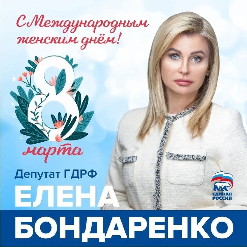 ! Поздравляю вас с нашим общим праздником – Международным женским днём! В этот день слова уважения и признательности хочу сказать матерям и жёнам наших защитников – героев специальной военной операции. Спасибо женщинам-волонтёрам и социальным работникам! Спасибо нашим женщинам-медикам – врачам, медсёстрам, санитаркам! Нашим учителям и воспитателям! Спасибо всем женщинам, кто ответственно трудится на своём рабочем месте, создаёт и поддерживает домашний очаг, воспитывает детей! Дорогие женщины! Желаю вам здоровья и как можно больше радостных моментов, ответной любви и заботы ваших родных! Оставайтесь такими же очаровательными и нежными, поддерживайте друг друга! Пусть свет, который исходит от вас – от ваших глаз и улыбок – освещает мир вокруг! Депутат ГД РФ Елена Бондаренко