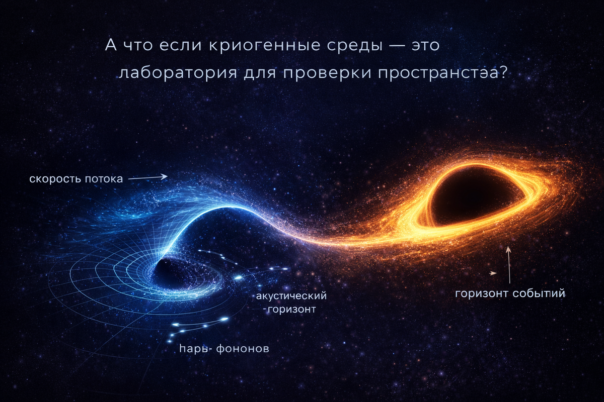 – параметры можно контролировать экспериментально Речь идёт о сверхтекучих жидкостях и конденсатах Бозе–Эйнштейна. Это особые состояния вещества, где миллионы частиц начинают вести себя как единое волновое целое. И именно в таких системах появляются явления, удивительно похожие на гравитационные. Если поток конденсата ускоряется достаточно сильно, возникает граница. По одну сторону возмущения могут распространяться свободно.