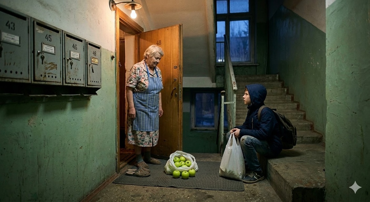 Мальчик носил яблоки чужой старухе — а его собственная бабушка уже ушла. Площадка четвёртого этажа. Коврик у двери, на нём — белый пакет. Внутри — антоновка.