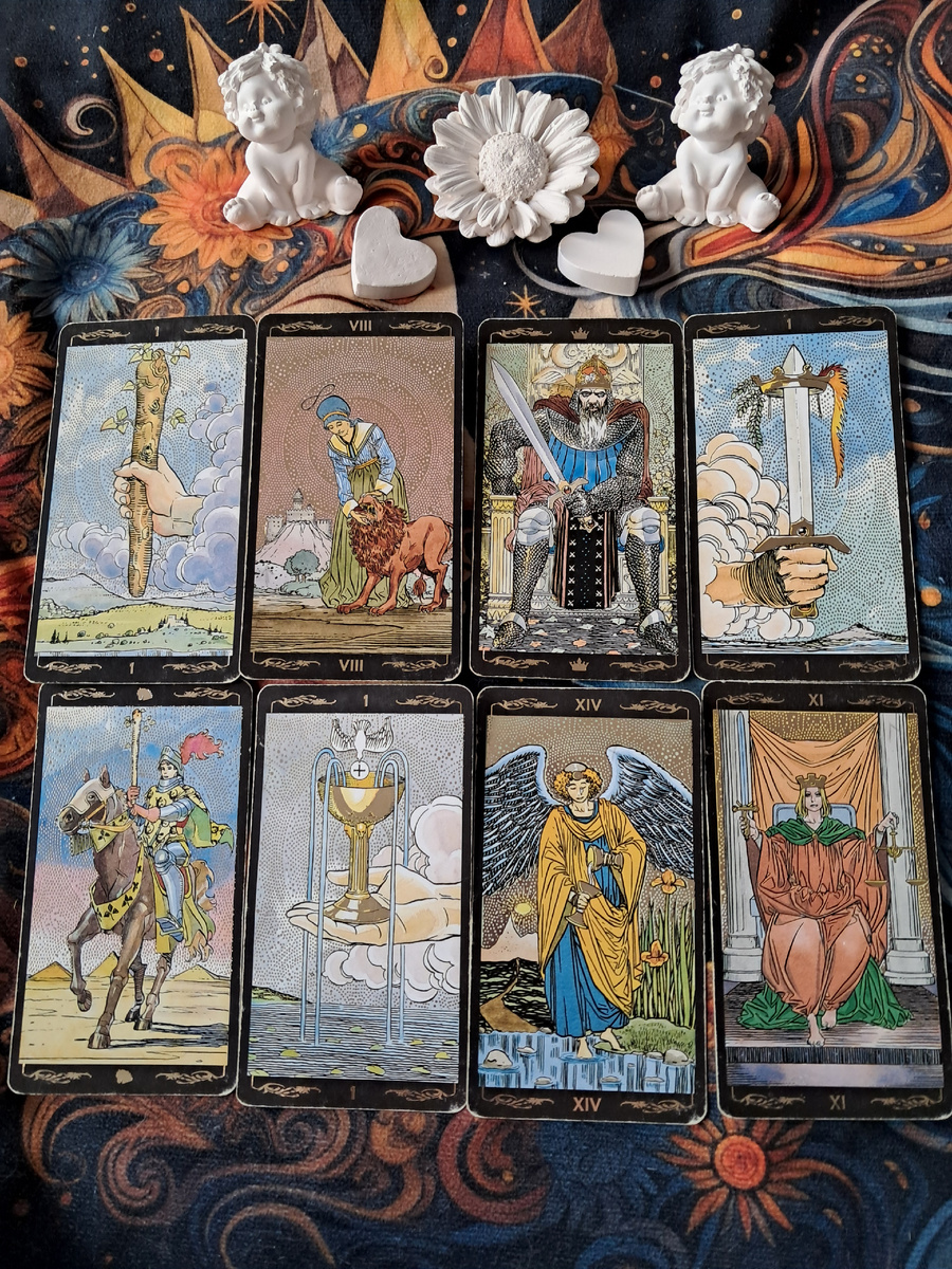 У вас в раскладе четыре Туза (Жезлов, Мечей, Кубков) и Справедливость в итоге. Это не просто «привет», это закладка мощного фундамента. Туз — это семя, потенциал, начало нового цикла. То, что их несколько, говорит о невероятной концентрации возможностей. Сил здесь более чем достаточно, главное — не расплескать.