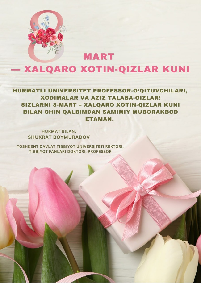 ! Sizlarni kirib kelayotgan 8-mart – Xalqaro xotin-qizlar kuni munosabati bilan chin qalbimdan samimiy muborakbod etaman. Ayollar jamiyatimiz hayotida, ayniqsa, ilm-fan, ta’lim va sog‘liqni saqlash tizimida muhim o‘rin tutadi. Ularning fidokorona mehnati, yuksak mas’uliyati, bilim va salohiyati mamlakatimiz taraqqiyoti hamda yosh avlodni har tomonlama barkamol etib tarbiyalashda beqiyos ahamiyatga ega. Universitetimiz jamoasida faoliyat yuritayotgan professor-o‘qituvchi va xodima ayollar, shuningdek, ilm olish yo‘lida izlanayotgan talaba-qizlarimiz o‘z bilim va iste’dodi, intilishi hamda matonati bilan ta’lim va tibbiyot sohasining rivojiga munosib hissa qo‘shib kelmoqda. Bugungi kunda sizlarning ilmiy izlanishlaringiz, pedagogik mahoratingiz hamda kasbiy fidoyiligingiz universitetimiz nufuzini yanada oshirishga xizmat qilmoqda. Shu bilan birga, sizlar jamiyatimizda mehr-oqibat, sabr-toqat va ezgulik timsoli sifatida alohida e’tibor va ehtiromga sazovorsiz. Muhtaram ayollar! Sizla