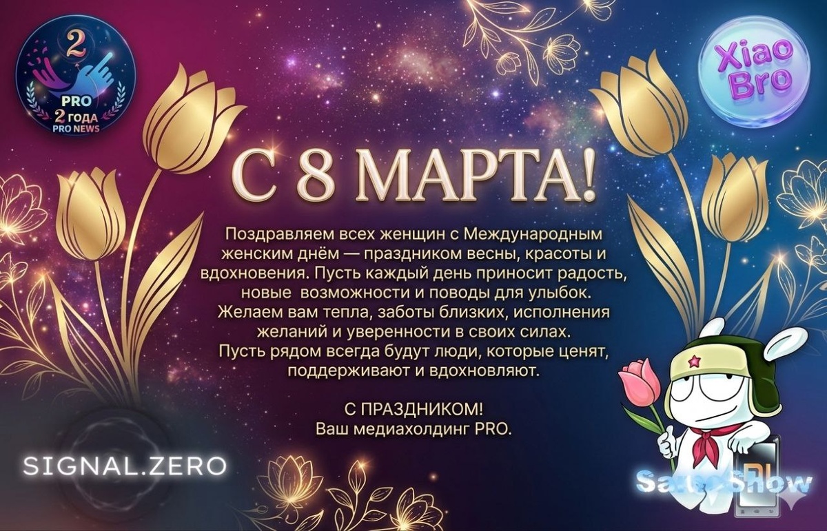 ! Поздравляем всех милых женщин с Международным женским днём — праздником весны, красоты и вдохновения. Пусть каждый день приносит радость, новые возможности и поводы для улыбок. Желаем всем вам тепла, заботы близких, исполнения желаний и много уверенности в своих силах. Пусть рядом всегда будут люди, которые ценят и вдохновляют. Еще раз с праздником вас! Кстати, продолжаем принимать работы для нашего конкурса: его итоги подведём вечером, поторопитесь! 🤩 PRO News | Boost От всей редакции медиахолдинга