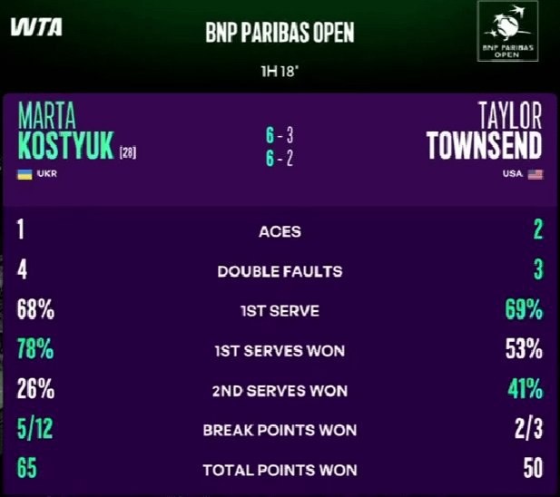 ⚡ WTA 1000 Indian Wells R2: [28]M. Kostyuk def. [Q] T. Townsend 6-3 6-2