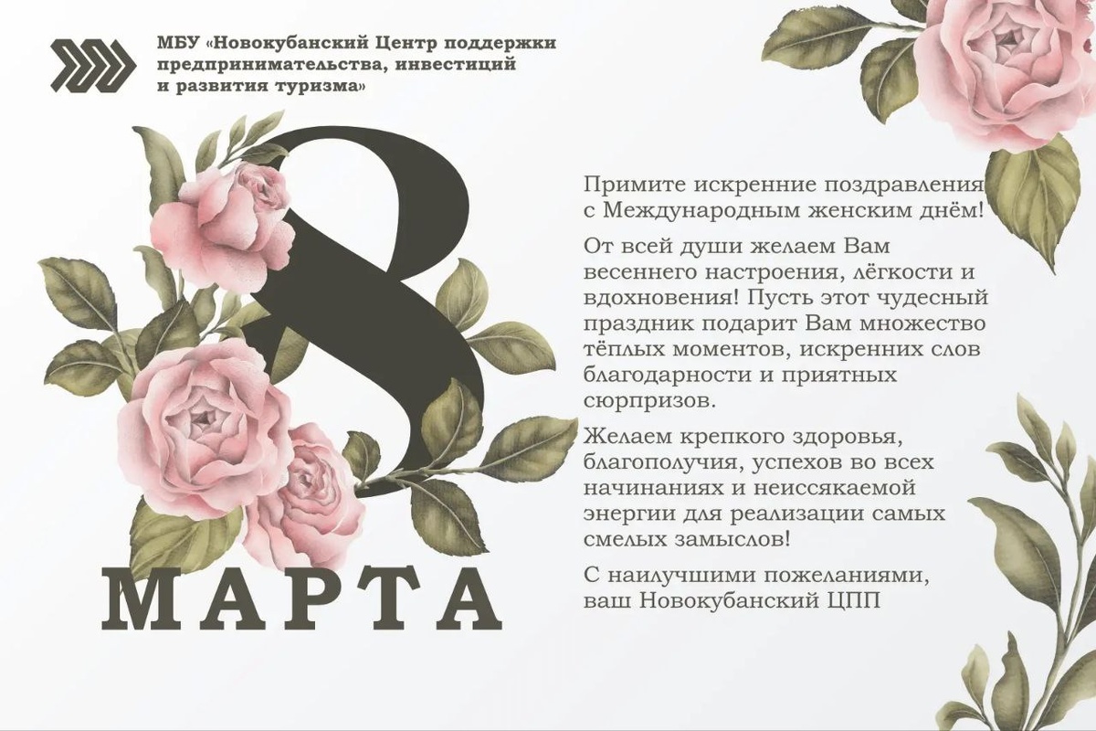! 🌸 От всей души поздравляем вас с 8 Марта! 💐 Вы доказываете каждый день: бизнес — это не только цифры и стратегии, но и чуткость, креатив, сила духа и умение создавать красоту вокруг. Спасибо за ваш труд, энергию и вклад в развитие нашего района! Напоминаем, 5 марта в Новокубанске прошла масштабная конференция для предпринимателей и самозанятых «Твоя весна успеха». На ней мы обменялись опытом, обсудили актуальные вопросы развития бизнеса и зарядились вдохновением для новых свершений! 📸 Фото площадок конференции вы найдете по ссылке https://saloniphoto.ru/disk/vesna-2026-gq6tnf С праздником! 🌷