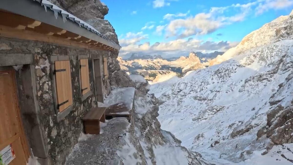 Каково это — жить там, где даже облака проплывают под ногами? В Доломитовых Альпах есть место, от которого перехватывает дыхание. Маленькая постройка словно приклеена к отвесной скале на высоте почти три километра. Вокруг только острые пики, ледяной ветер и пустота.