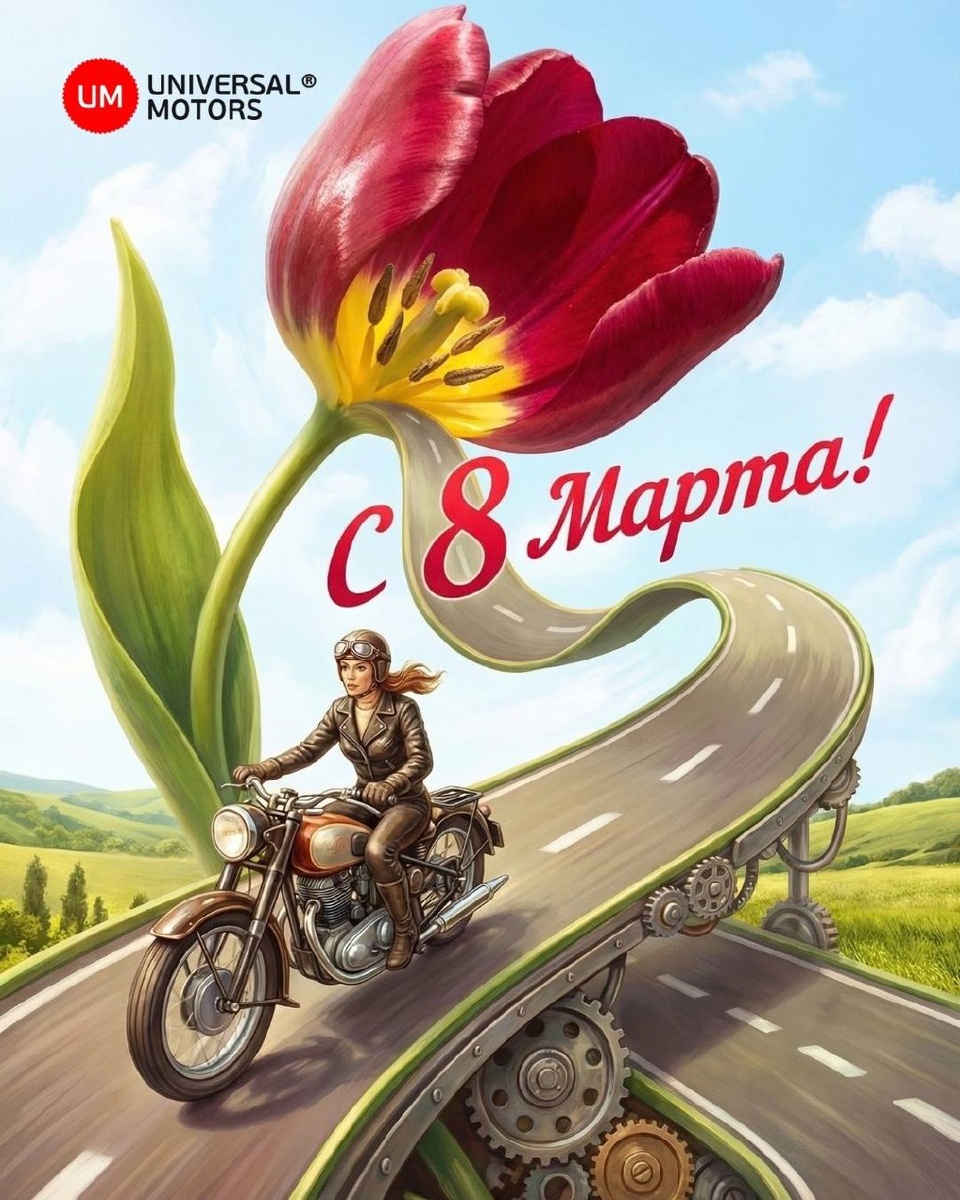 ! 🌷 Universal Motors поздравляет вас с 8 Марта - праздником силы, свободы и вдохновения! ✨ Вы - как идеальный мотоцикл: сочетаете мощь и лёгкость, уверенность и грацию, скорость и точность. Благодаря вам дороги становятся ярче, маршруты - смелее, а каждый новый поворот - поводом для уверенной улыбки 😊 Пусть ваш путь будет ровным и захватывающим, пусть двигатель сердца работает только на радость, а рядом всегда будут те, кто поддержит на любом маршруте. Желаем вам ярких эмоций, надёжных спутников и бесконечного запаса внутреннего топлива для новых побед ⭐ С праздником весны и свободы движения! С уважением, Команда Universal Motors 🏍
