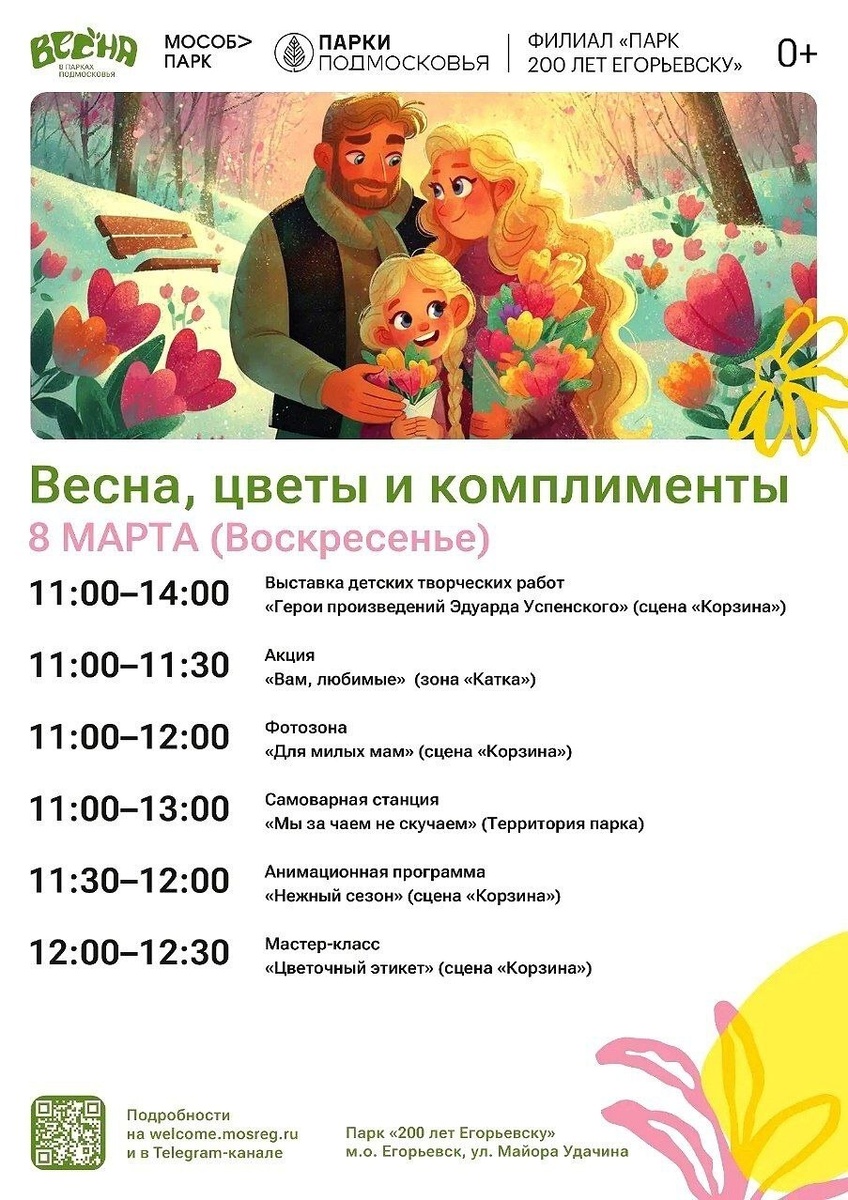 ! Что ждет гостей? 🌷Выставка детских творческих работ «Герои произведений Эдуарда Успенского» 🌸Акция по раздаче тематических открыток «Вам, любимые» со сказочным персонажем Чебурашкой 💐Тематическая фотозона «Для милых мам» 🌹Самоварная станция «Мы за чаем не скучаем» 🌺Анимационная программа «Нежный сезон» 🌼Творческий мастер-класс «Цветочный этикет» Приходите всей семьёй, чтобы наполнить этот день радостью, улыбками и отличным настроением! 0+ 💐 #Подмосковье #Егорьевскоетелевидение #Егорьевскоетв #администрацияЕгорьевск