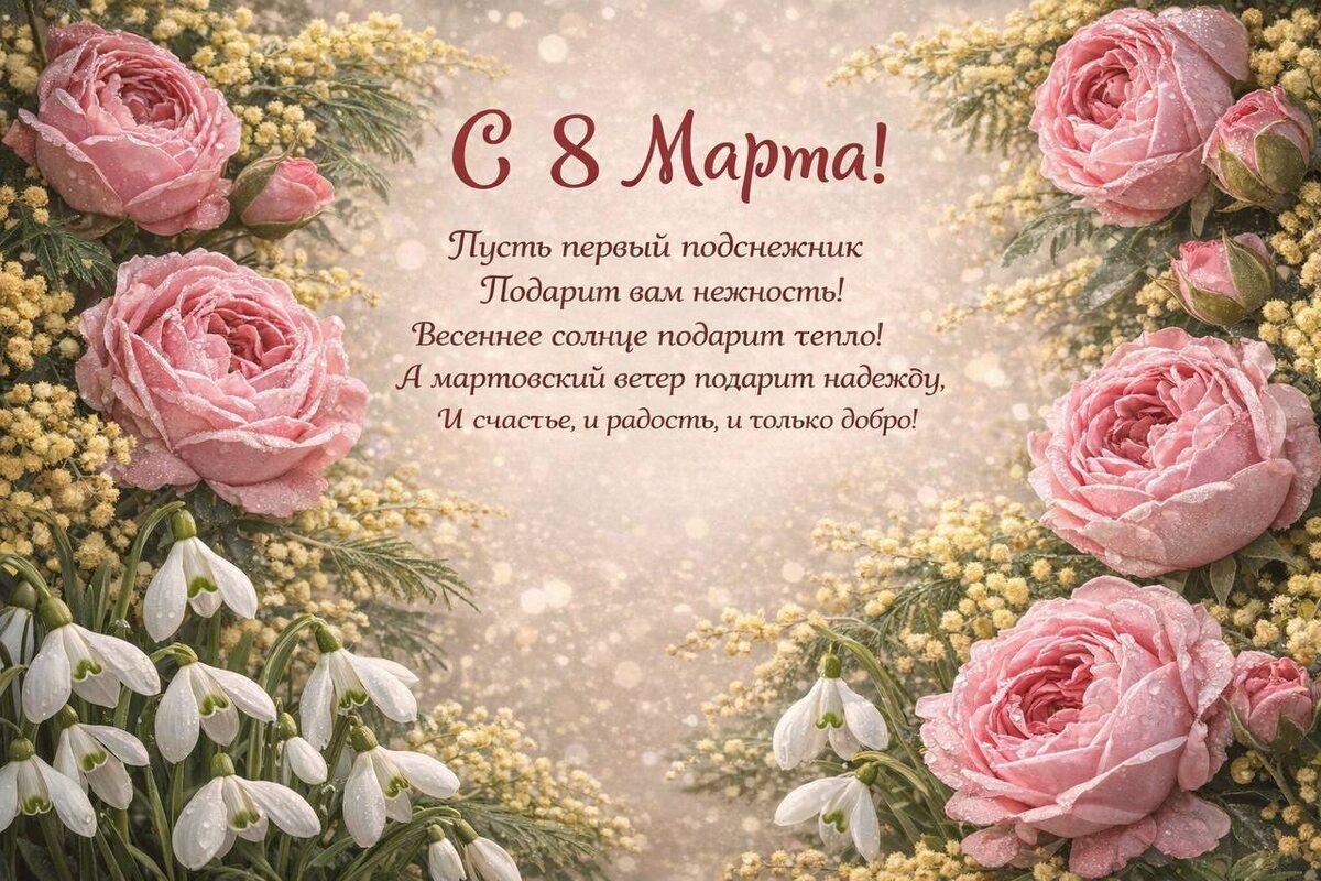 ! Примите мои искренние поздравления с Международным женским днём, Днём 8️⃣ Марта! 🎁 Вы — души и сердца в жизни наших мужчин ❤ Всё лучшее на свете – от вас: любовь и душевное тепло, забота и надежда, чуткость и нежность. Будьте всегда красивы, обаятельны и любимы! Пусть этот прекрасный день, наполненный весенней свежестью и ароматом цветов, принесет вам всё, о чем вы мечтаете! Желаю всем вам счастья, здоровья и успехов! Пусть ваши близкие всегда будут рядом, а ваши дома наполнены радостью и звонким смехом ваших детей и внуков! Пусть каждый день вашей жизни будет наполнен радостью и теплом. С праздником ВЕСНЫ!❤️🌱🌸🌷 🌷 🌷 💐 💐 💐