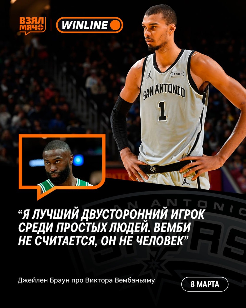 ? Во время трансляции Джейлен Браун рассказал о том, кого он считает лучшим двусторонним игроком. 🗣 «Вемби — проблема, реально большая проблема. Когда я говорю, что я лучший двусторонний игрок в лиге, я не учитываю Виктора. Мы его не считаем, ведь он даже не человек». Согласны с Джейленом? 🏀 ПОДПИШИСЬ — ЗДЕСЬ ЖИВЁТ БАСКЕТБОЛ!