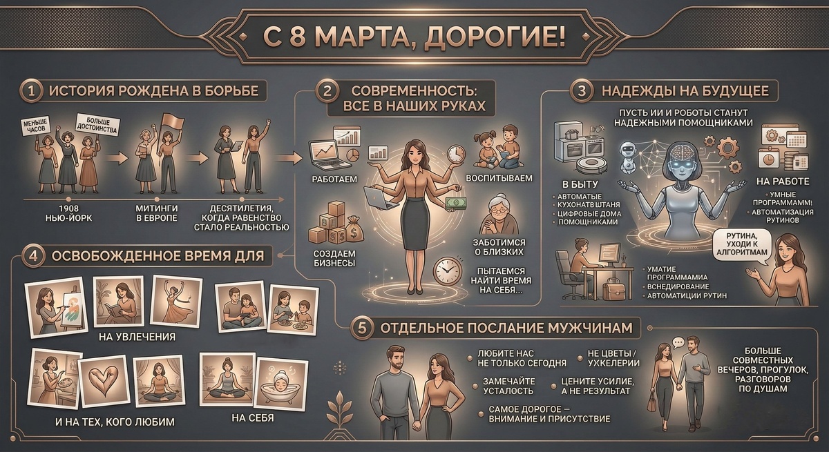 ! Знаете, что этот праздник появился не как день тюльпанов и открыток. В 1908 году тысячи работниц вышли на улицы Нью-Йорка с одним требованием: меньше часов, больше достоинства. Потом были митинги в Европе, потом десятилетия, когда слово «равенство» из лозунга превращалось в реальность. Медленно, но превращалось. Сегодня мы работаем, воспитываем, создаем бизнесы, заботимся о близких. И где-то между всем этим пытаемся найти время на себя и на тех, кого любим. Не всегда получается. ✨ Поэтому у меня в этом году одно искреннее пожелание: пусть нейросети, роботы-ассистенты и гуманоиды, которые уже стучатся в нашу жизнь, наконец-то станут теми самыми надежными помощниками. В быту. На работе. Рутина, которая съедает часы и силы, пусть уходит к алгоритмам. А время остается нам. На себя. На увлечения. И на любимых людей рядом. А мужчинам хочется сказать отдельно: любите нас не только сегодня. Замечайте, когда мы устали. Цените не результат, а усилие. Самое дорогое, что вы можете подарить,
