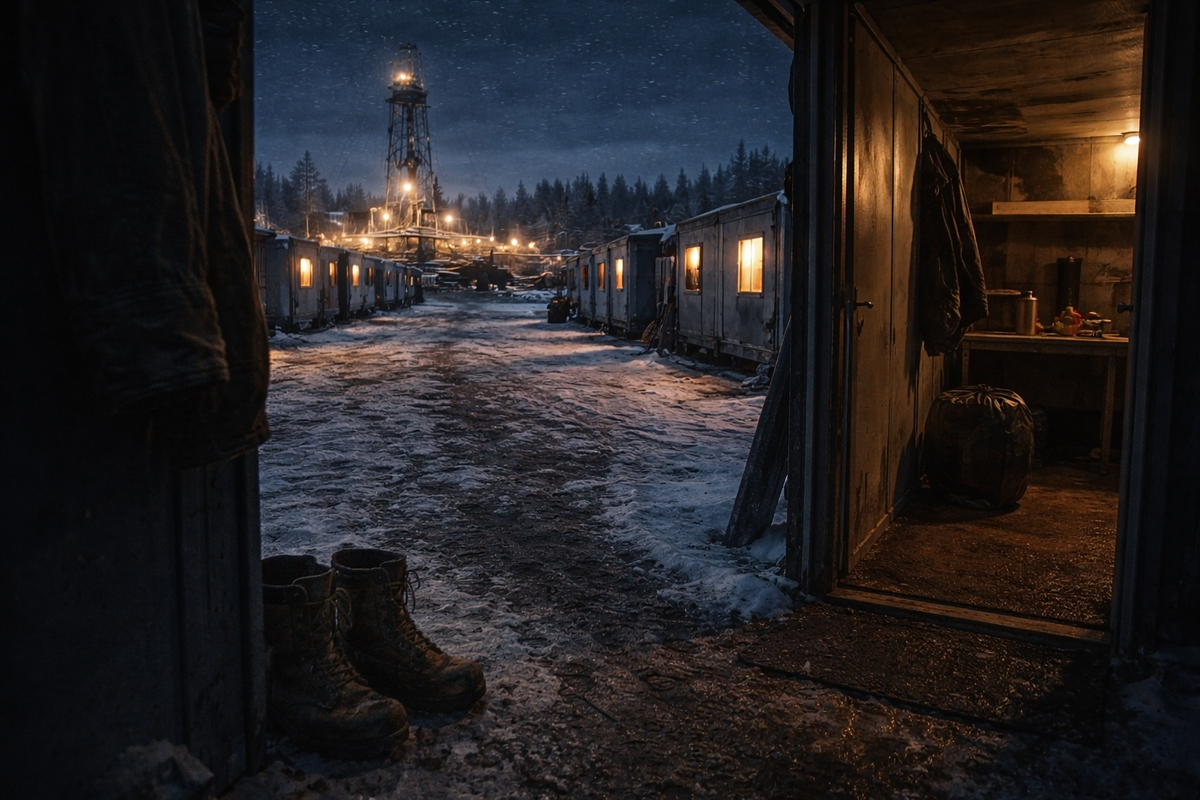 Иногда на вахтовке. Фары машины выхватывают из темноты куски дороги. Лес вокруг стоит чёрной стеной. Никто почти не разговаривает. Все устали. Иногда кто-то шутит. Но чаще люди просто смотрят в окно. Потому что после 10–12 часов работы слова становятся лишними. Когда вахтовка подъезжает к базе, первое, что