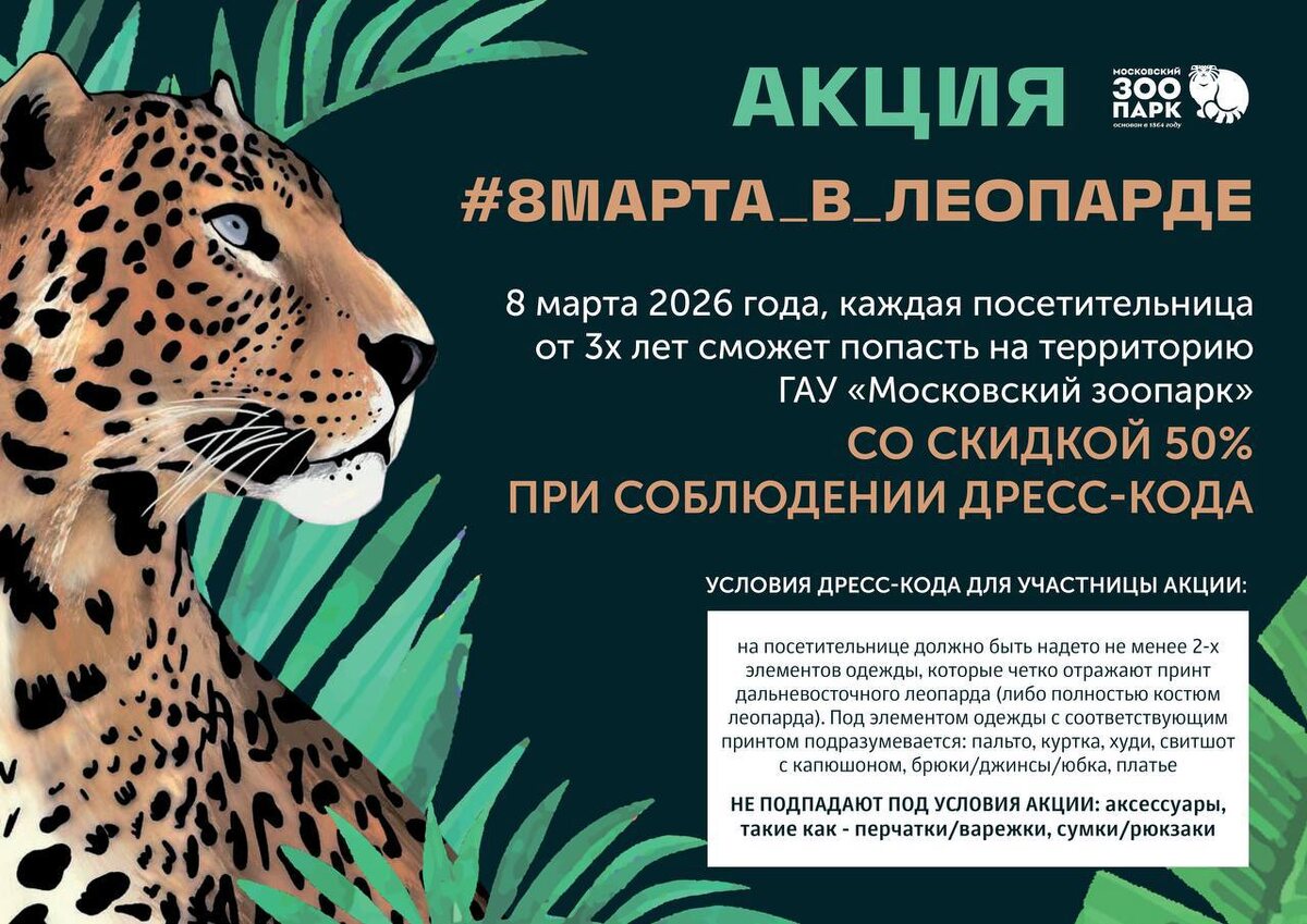 ! 🗓️8 марта 📍Московский зоопарк Посетительницы смогут приобрести входной билет с 50-процентной скидкой, придя в одежде с леопардовым принтом или костюме леопарда. 🐆Акция распространяется как на взрослую, так и детскую категории билетов для представительниц женского пола. 👖На посетительнице должно быть надето не менее 2-х элементов одежды, которые четко отражают принт дальневосточного леопарда (либо полностью костюм леопарда). Под элементом одежды с соответствующим принтом подразумевается: пальто, куртка, худи, свитшот с капюшоном, брюки/джинсы/юбка, платье (перечень на выбор, как основной элемент одежды, аксессуары не в счет. 🏡Акционные билеты можно приобрести в кассах на Главном входе и Новом входе со стороны станции метро Баррикадная. 🦁Мы приглашаем вас полюбоваться на диких кошек: героя дня – леопарда Мизера, семейство рысей, пуму Габриеля, тигра Степана, группу львов, дальневосточную лесную кошку, камышового кота Заури и, конечно, манула Тимофея. 🌿Можно также обратить