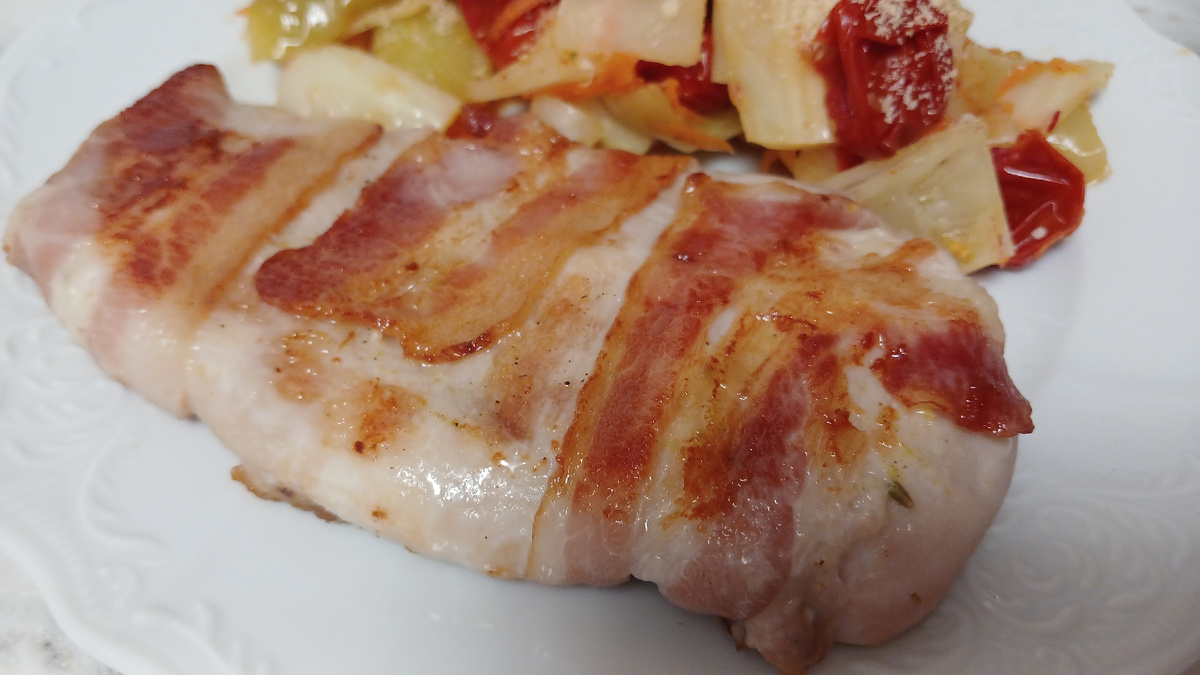 Казалось бы, простое куриное филе, что в нем особенного. Самая бюджетная еда - это именно курица. Для многих на праздничное блюдо она никак не тянет. А вот простое, да не простое блюдо! ☝ Филе получается невероятно вкусным! Скажу, что это роскошное бюджетное (вот такой каламбур) блюдо на любой праздник. Курица - самое недорогое мясо, к ней добавить упаковку бекона - и получается шедевр 👌 Я часто покупаю кур целиком, разделываю и получаю сразу несколько филе. Каждое филе грудки разрезаю вдоль пополам. Натираю солью, черным свежемолотым перцем и заворачиваю в ленты бекона. Затем вариантов несколько: 1. готовить (без крышки!) на горячей сухой сковороде 2. готовить на сковороде-гриль 3. запечь в духовке В духовке все просто: выложил в форму для запекания и при 180* держать в духовке до готовности филе. На сковороде-гриль: я хорошо разогреваю сковороду, обжариваю филе с обеих сторон на большом огне (7-8/10), затем нагрев уменьшаю до 4/10 и довожу филе до готовности, один раз перевер