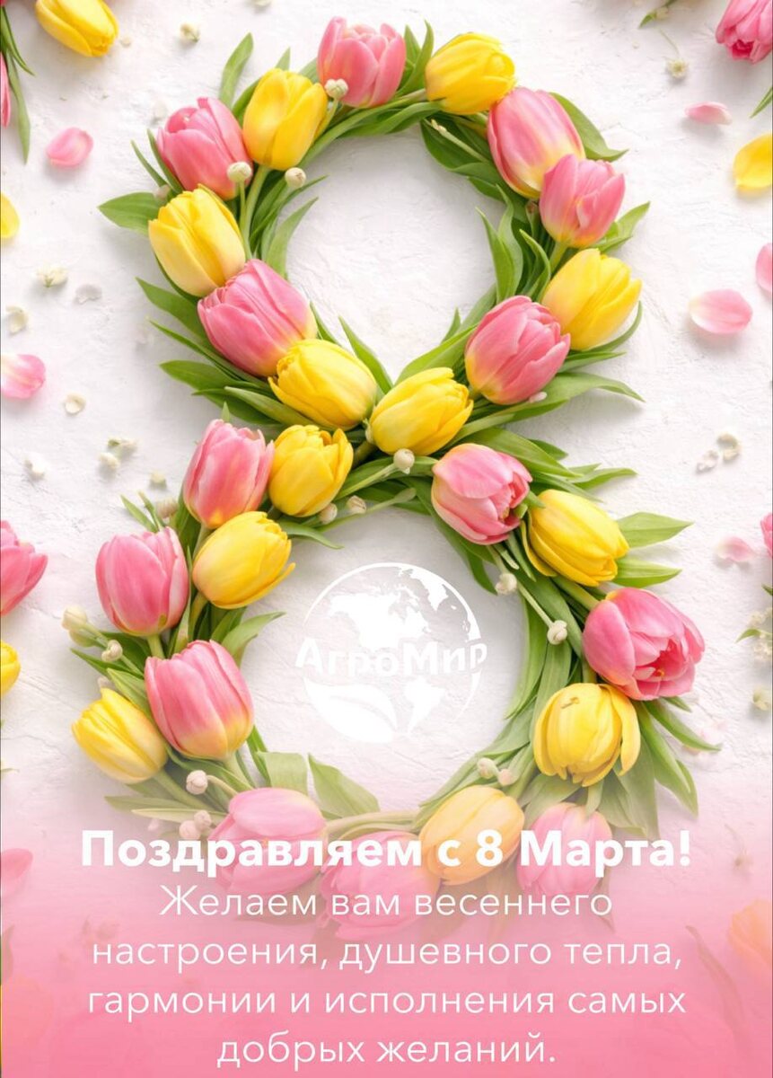 ! 🌷 Поздравляем вас с 8 Марта! Пусть эта весна принесёт вам много света, тепла и хорошего настроения. Пусть каждый день радует новыми возможностями, приятными событиями и улыбками близких. Желаем вам красоты, гармонии, вдохновения и уверенности в своих силах. Пусть всё задуманное обязательно сбывается, а жизнь радует так же щедро, как плодородная земля радует хорошим урожаем. С праздником весны! С уважением, команда «АгроМир» 💚