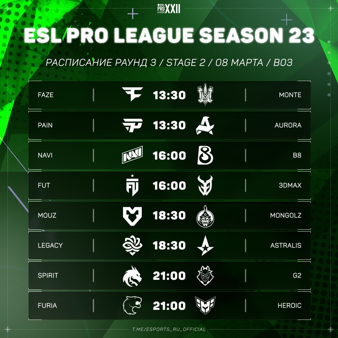 🟠Матчи за выход в плей-офф: 🇪🇺 MOUZ vs The MongolZ 🇲🇳 🇷🇺 Team Spirit vs G2 🇪🇺 🟠Матчи за выход в следующий раунд: 🇧🇷 paiN vs Aurora 🇷🇺 🇪🇺 NAVI vs B8 🇺🇦 🇪🇺 FUT vs 3DMAX 🇫🇷 🇧🇷 Legacy vs Astralis 🇩🇰 🟠Матчи на вылет: 🇪🇺 FaZe vs Monte 🇪🇺 🇧🇷 FURIA vs HEROIC 🇩🇰 👍 Esports.ru | CS
